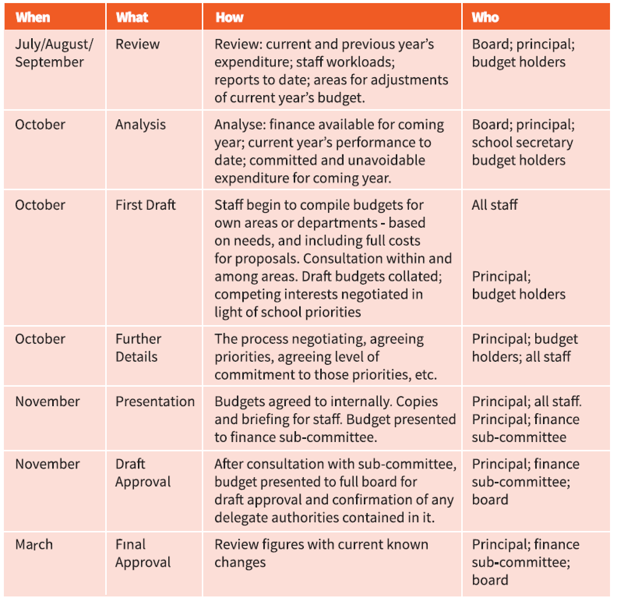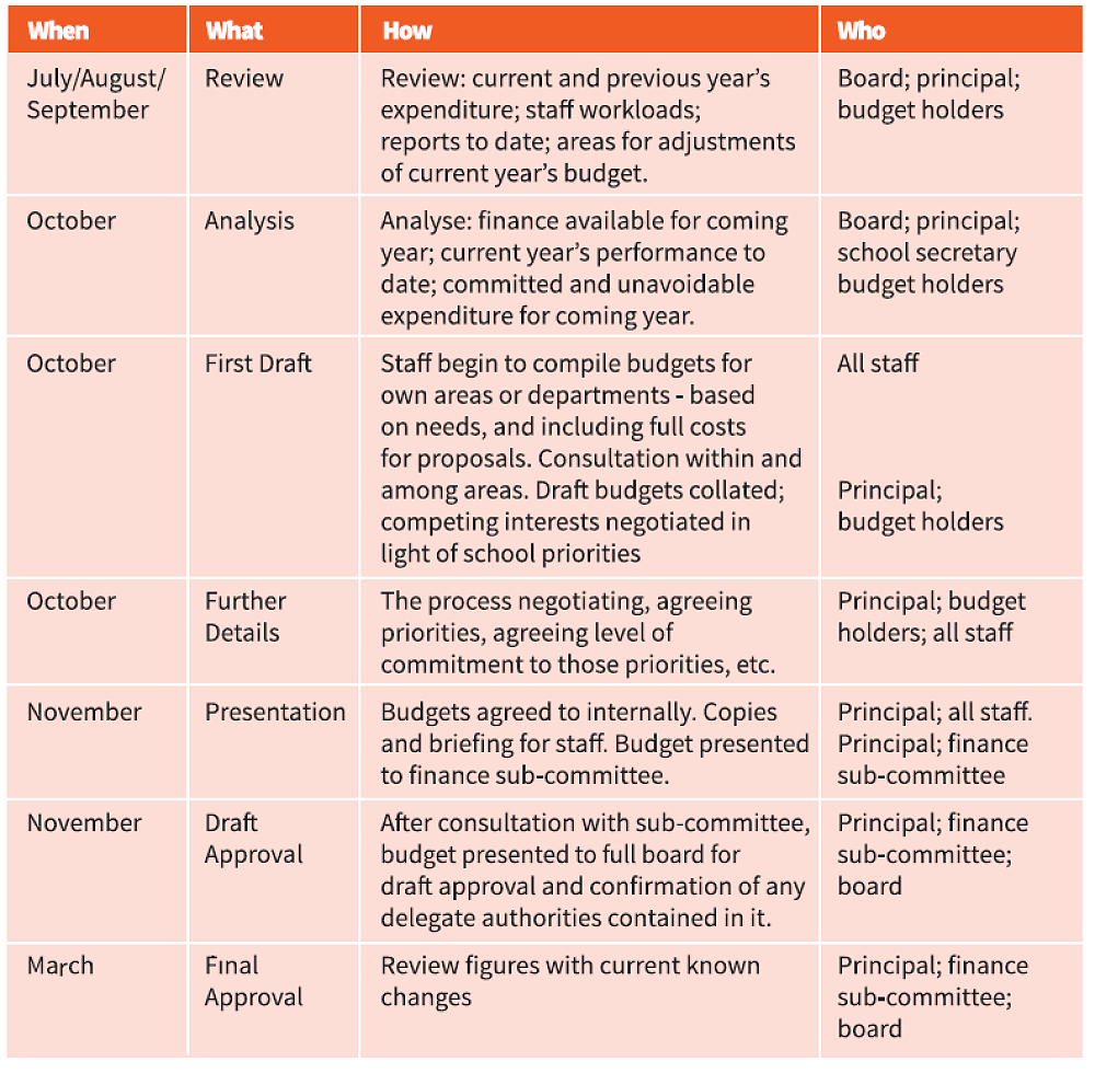 1. Obviously, every school will have a different timeline for its budgeting cycle and a different allocation of responsibilities. In many cases, the finance sub-committee may be involved in place of the board, except for final approval. In other cases, the sub-committee may assist with preparing final draft budgets.