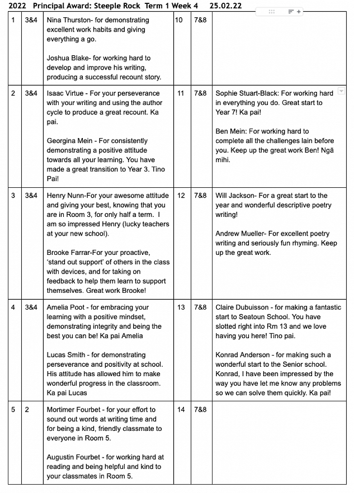 Principal's Award Photo by Te Kura o Kirikiri Tatangi - Seatoun School Principal's Awards 10 March Carolyn Newman — November 24th, 2021 Term 1 Week 4 Principal's Awards 10 Mar 2022 — Image by: Carolyn Newman Principal's Awards 10 March 2022 — Image by: Carolyn Newman