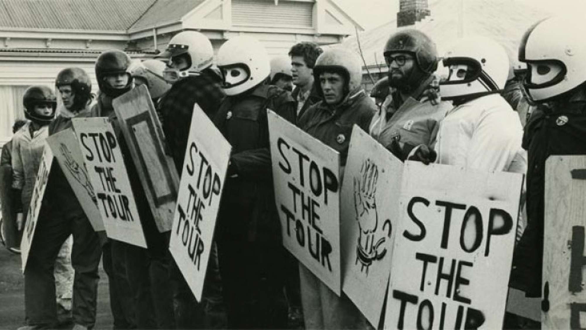 Following a strict chronology of events, Patu! begins at the announcement of the 1981 tour, before any rugby games have taken place and before the South African team has even arrived in the country. Meetings at the HART (Halt All Racist Tours) headquarters in Auckland show that group planning a campaign of public education on the realities of the apartheid regime, posting flyers, collecting signatures for petitions and unifying their sense of purpose as a group. At this point the filming is largely indoors, with stable lighting conditions and among a sympathetic crowd.