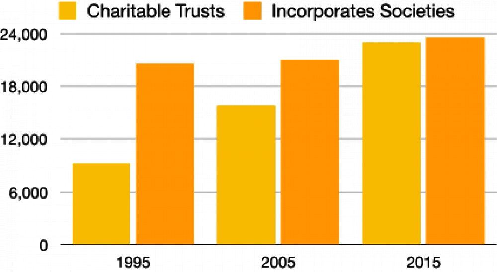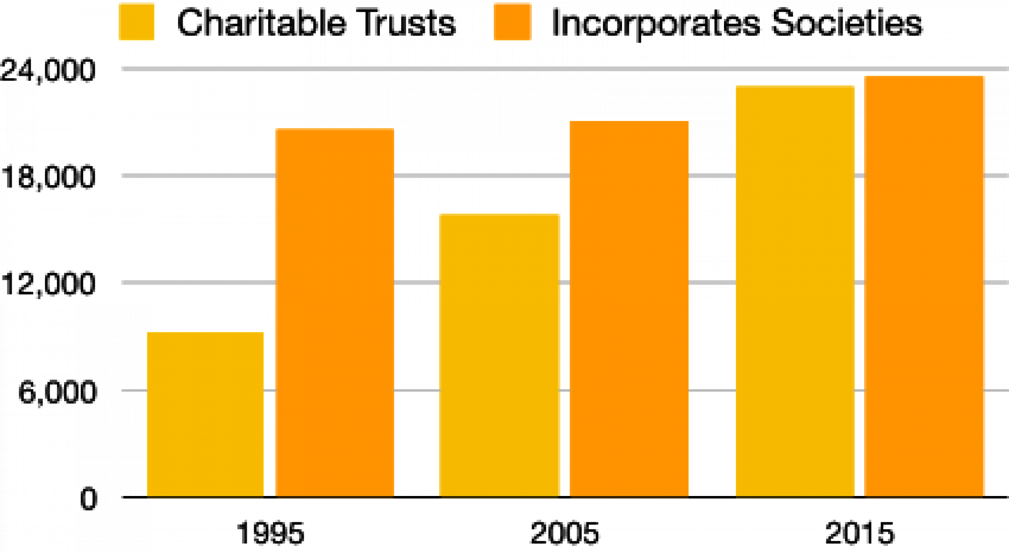 These days we are less ‘social’ but more ‘trusted’. Back in 1995, incorporated societies were over twice as prevalent as charitable trusts.
