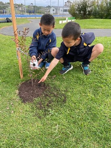 Some of our Year 1 Kauri team children have been kaitiaki and caring for the trees by watering them using their recycled milk bottles they collaboratively decorated in art class for conservation week.