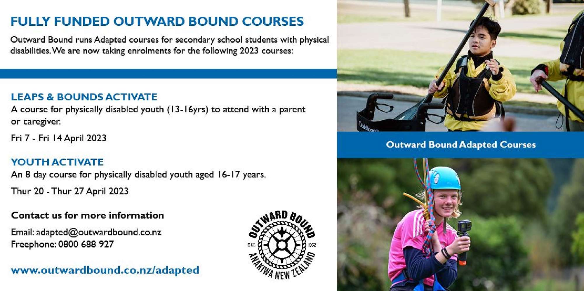 To find out more, see www.outwardbound.co.nz/adpated or contact us:
