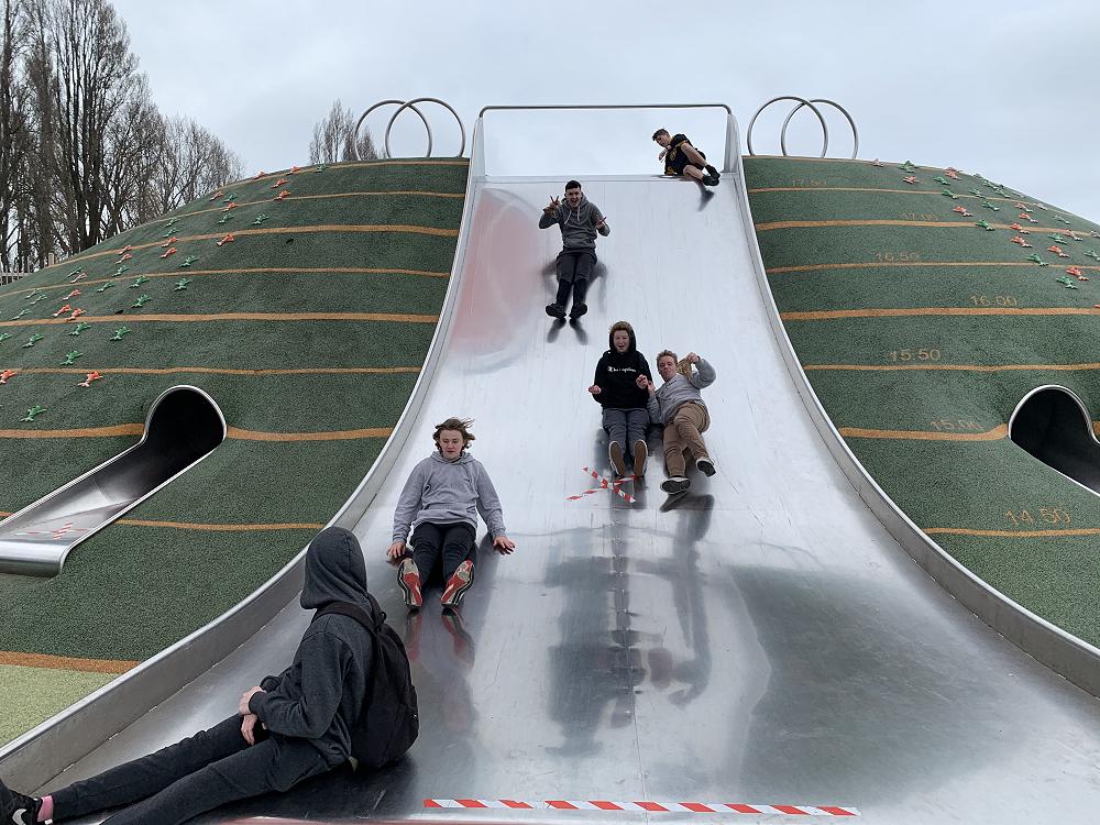 The best stop was Margaret Mahy Playground. This is an all-age playground in the Central City on the banks of the Avon River. It is a part of the governments ‘recovery plan’ for the 2011 earthquake as a ‘city-wide playground’. The playground opened to the public on the 22nd of February 2015. One week before the playground opened CERA released a press statement saying the playground cost $3 million to build, but within a few days, it had become clear that $3 million was only a fraction of the total cost. The Press reported that the playground’s cost was more than $40 million, although the playground itself was $3 million. Here we meet Mr Howell’s class for some kai and to play. Of course Mr Howell had to point out the Geographic base of the playground – the contour lines on the ground, something I had never notice before.