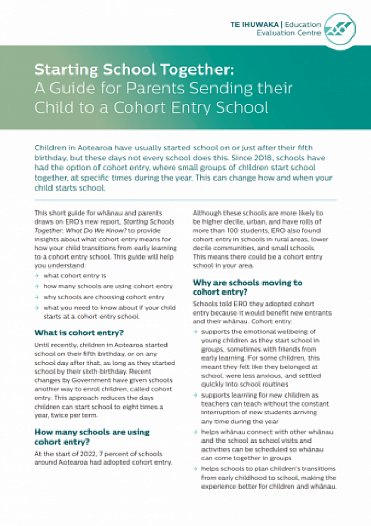 Cohort entry is when new entrant children start school in groups through the year rather than on their fifth birthday. The Ministry of Education and Education Review Office are encouraging schools to take this approach.