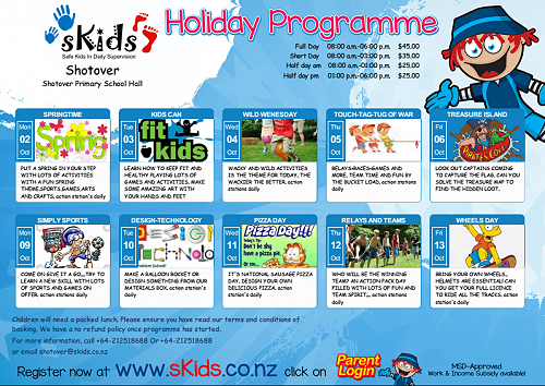 Please see website for booking information or contact Vicki on 0212518688 or email shotover@skids.co.nz