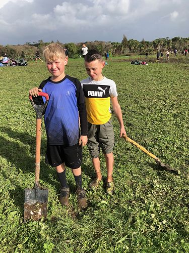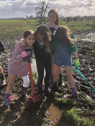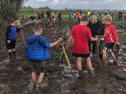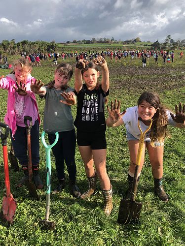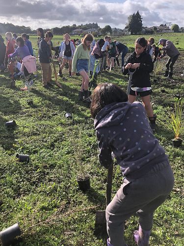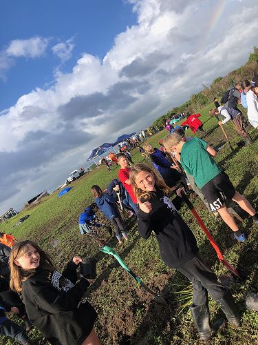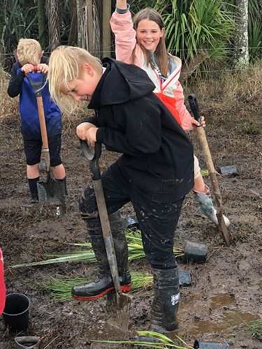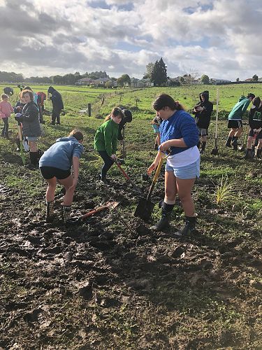 The ground was soft and very wet, hence trees were planted in record time and gumboots were often lost to the suction of mud. Many students had to be rescued from being stuck in the mud, so there were lots of smiles and support from each other. We came back to school satisfied with our community work and very muddy. Thanks for all your great work and mucking in even though it was very wet.