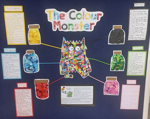 After reading 'The Colour Monster' we made jars to represent the different emotions the monster felt in the story; yellow for happiness, blue for sadness, red for anger, black for fear, green for calmness and pink for love. As a class we talked about different scenarios that have made us feel some of those emotions before. We then made the colour monster using all the different colours from the book and added some of our words to the wall.