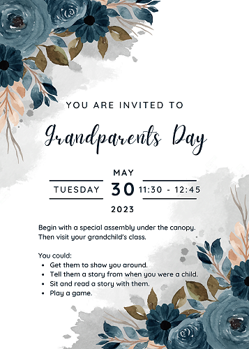 You are invited to Grandparents Day on Tuesday, 30th May from 11.30 to 12.45pm. The day will begin with a special assembly under the canopy after which you will have the opportunity to visit your grandchild's class.