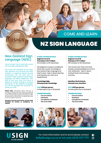 NZ Sign Languages classes will be held in Hamilton and Cambridge in Term 4. Cambridge is a Level 1a beginners class and Hamilton is Level 1b. Classes will be starting the week of the 18th of October. See the flyer attached.