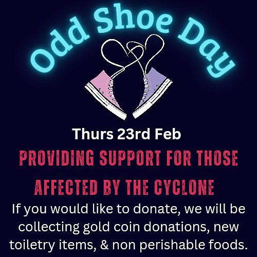 ODD SHOE Day - a BIG, BIG THANKYOU to everyone who donated yesterday morning in support of those affected by the cyclone. We will be collecting items all week; any further donations can be dropped off at the School Office.