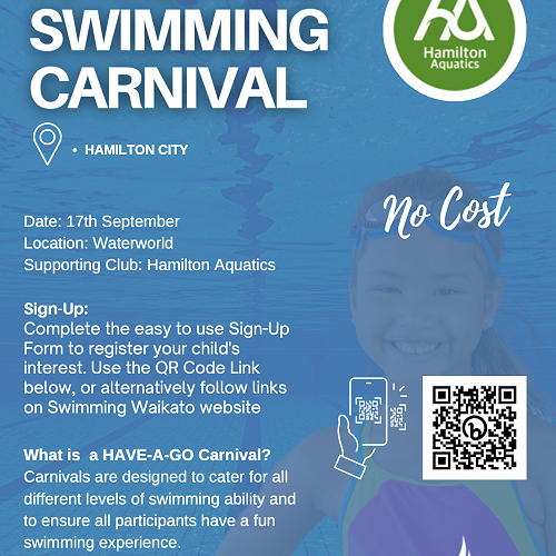Visit this articleHamilton Aquatics is looking forward to running a Learn to Swim programme at Hillcrest Normal School and Hamilton West schools this coming summer. As a 'warm up' Swim Waikato has arranged a fun, free swimming "have a go" day at Waterworld. See the attached poster.