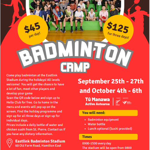 Visit this articleWaikato Badminton Association is hosting another holiday programme this coming holiday break from 25th to 27th September and 4th to 6th October.