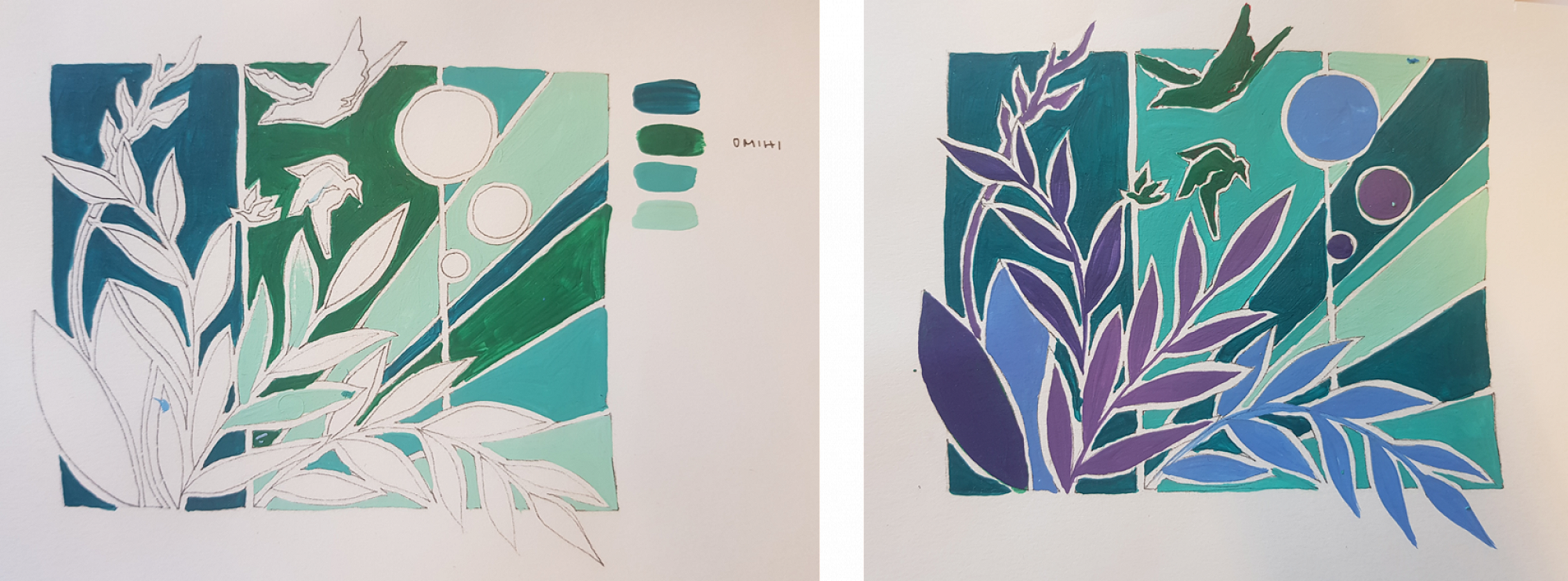 One of the most challenging parts of the design process was deciding on the colour scheme – I painted many, many versions of the design in all manner of colours. I wanted something bright and bold, but that was hard to achieve without accidentally creating an eyesore. I also didn’t want a huge range of colours, because that would make the mural too busy. It was a difficult process. Luckily, I had the help of some good friends (thanks Tim and Charlotte) who offered their opinions when I could no longer form any of my own.