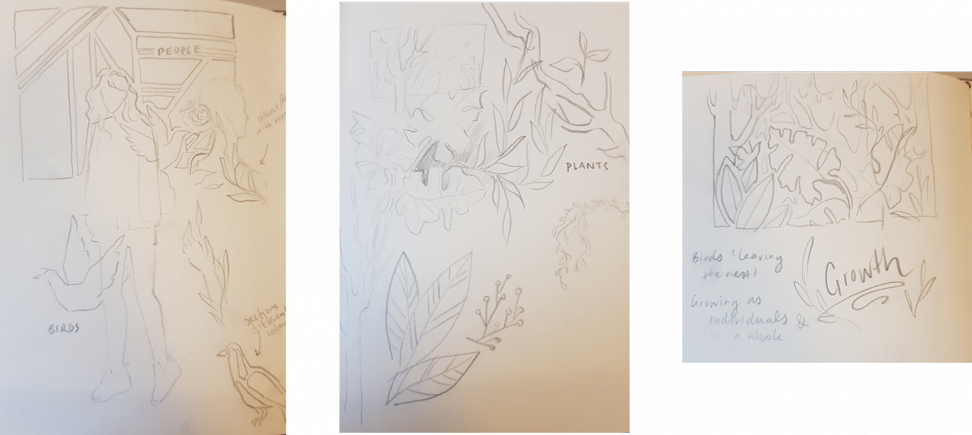 After that, I realised I should probably decide what exactly I wanted to paint. I began my design process by doing quick, freehand sketches of some elements I was interested in using. Things like plants, birds, people, shapes, anything that came into my mind. At one point I considered trees and buildings, possibly even the famous clocktower. I had painted a mural before, a much bigger one at my high school. I wanted this one to be even better than the last.