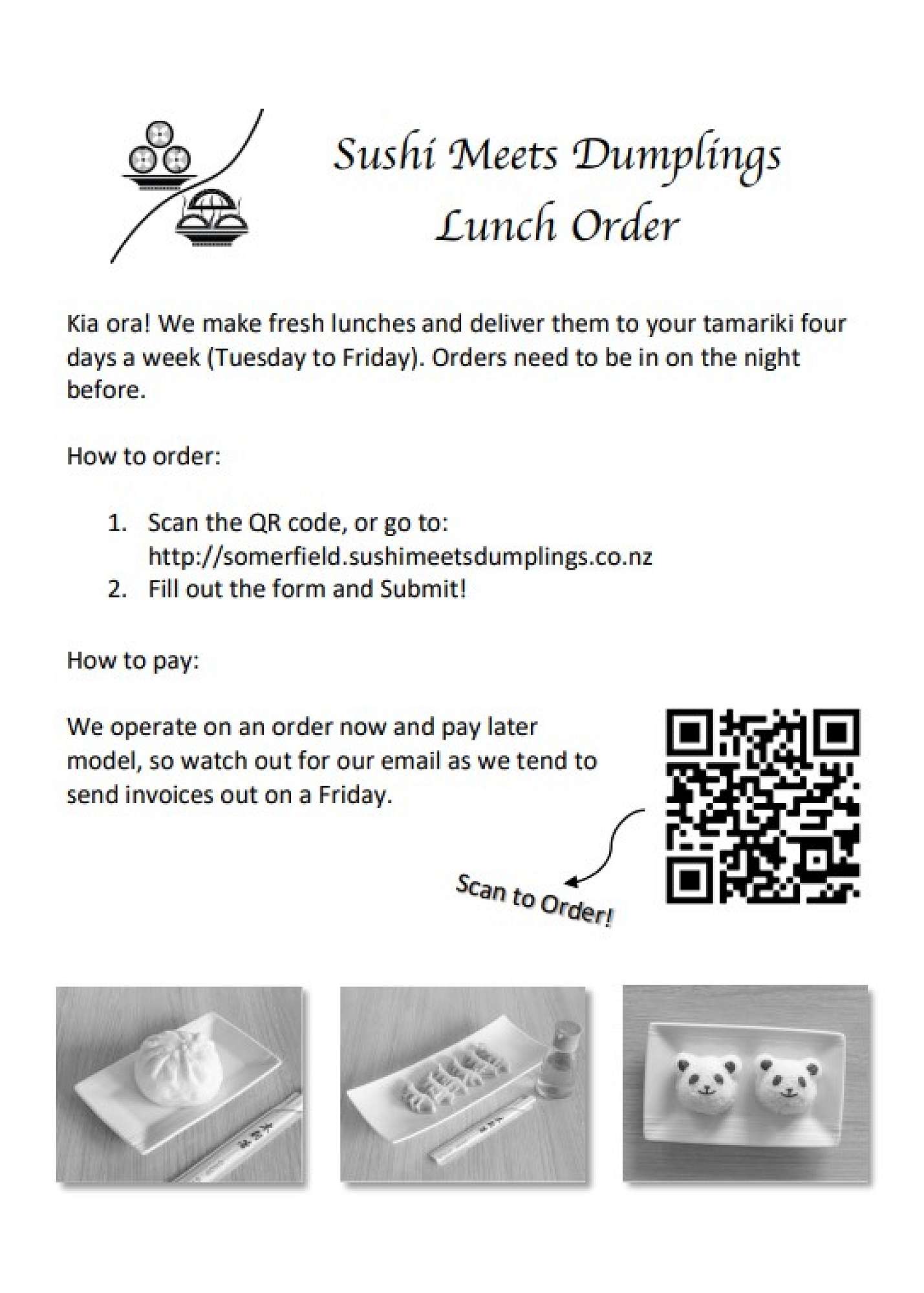 Photo by Julie Bassett sushi Meets Dumplings Lunch Order Julie Bassett — January 25th, 2024 How to order - (Tuesday to Friday) Orders need to be in on the night before. Image by: Julie Bassett
