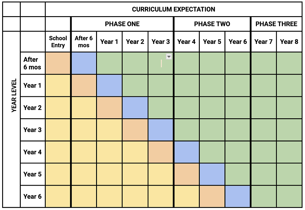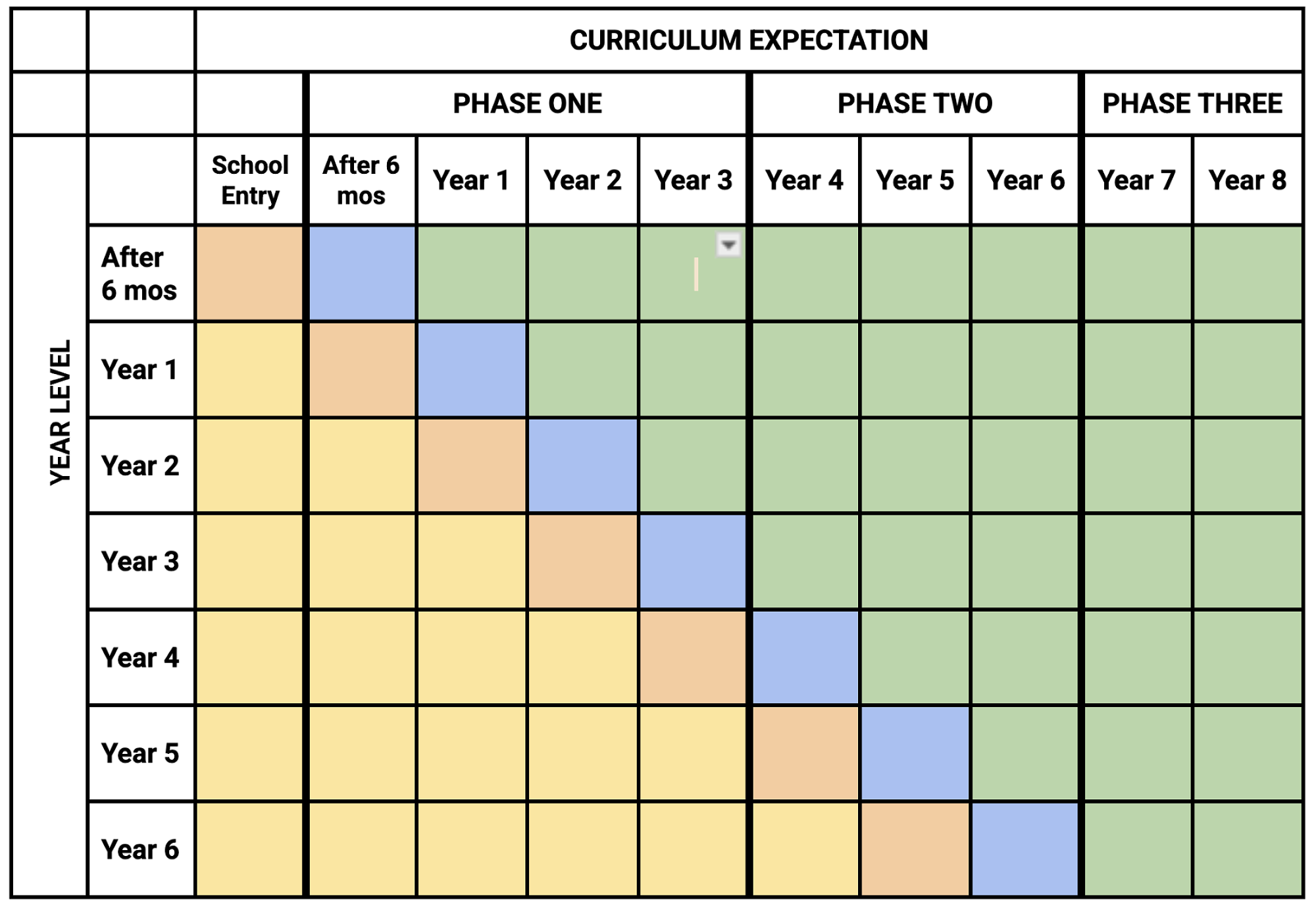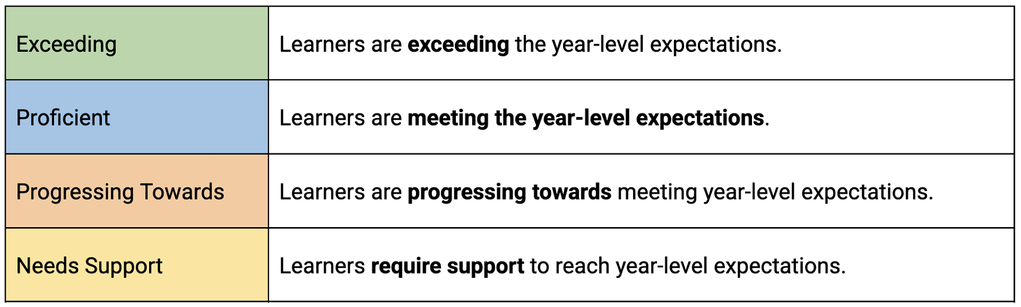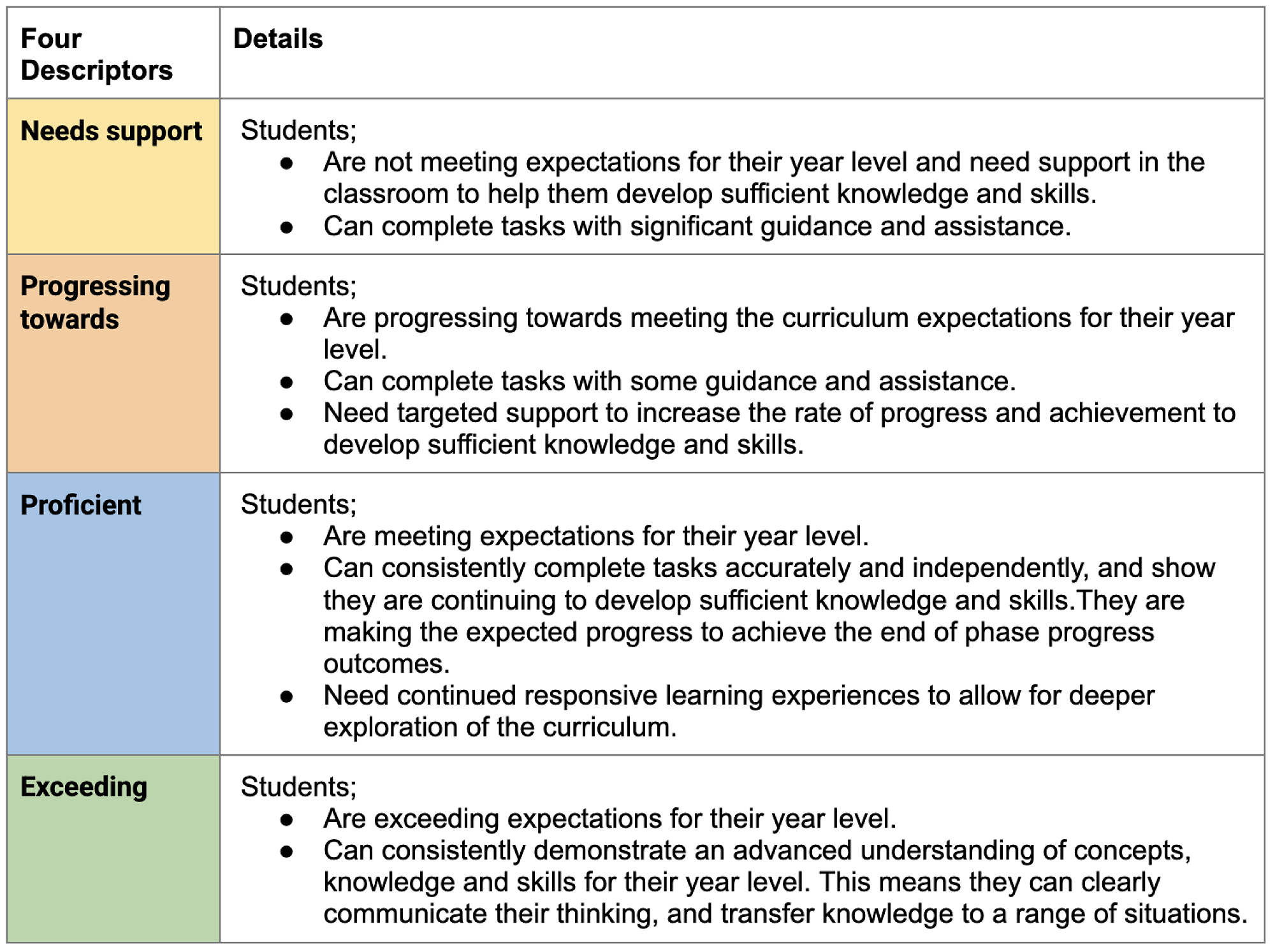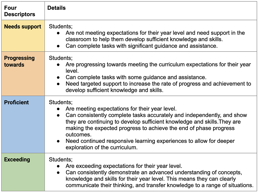 Using the two phases of learning, we have reconfigured the curriculum expectation tables and language, in line with MOE guidance. This is what you can expect to see in the mid-year report.