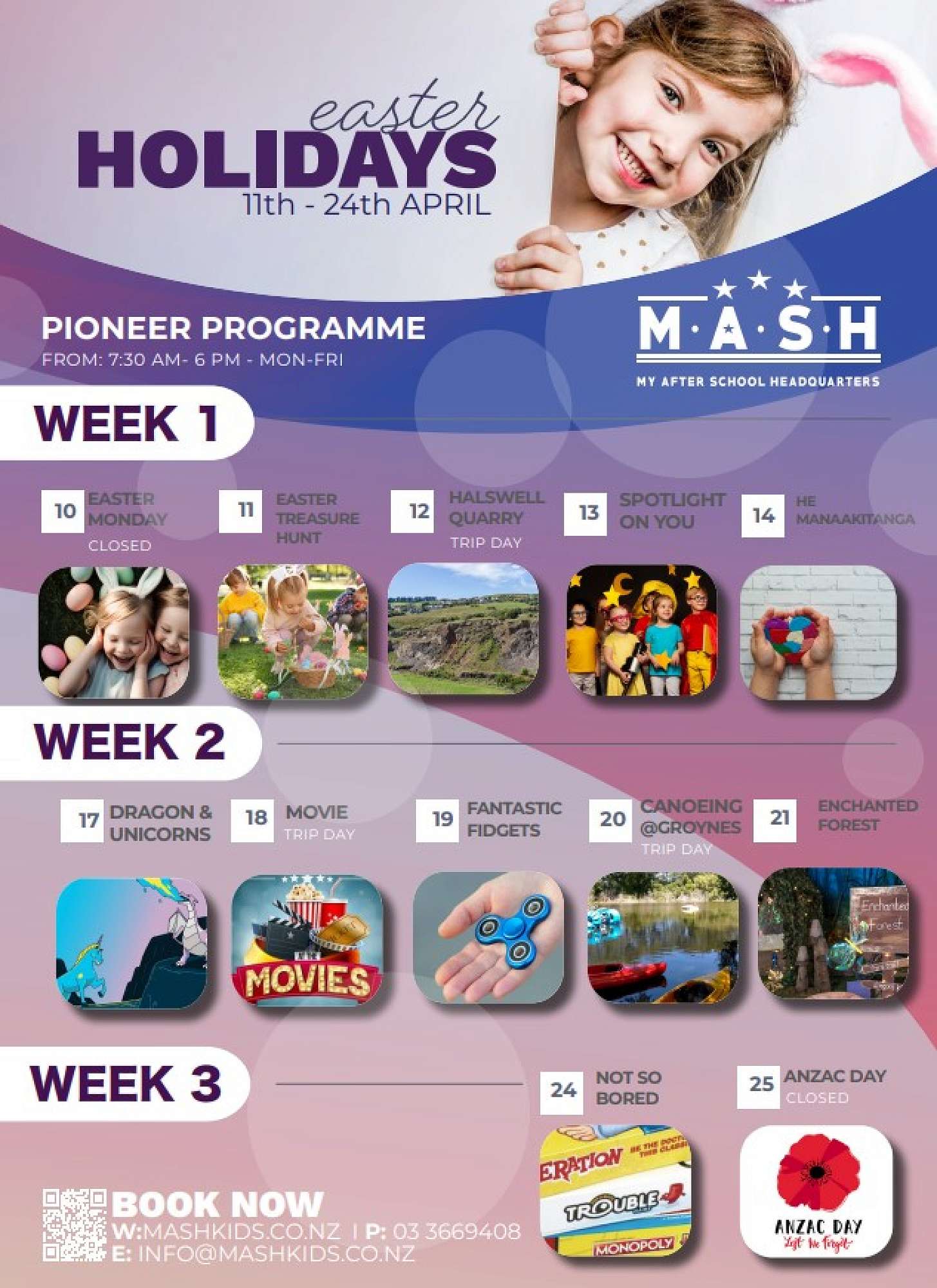 MASH will be running the programme from Tuesday 11th April through to the 24th April at MASH Pioneer.Term 2 starting back as normal before and after school care on the 26th April.