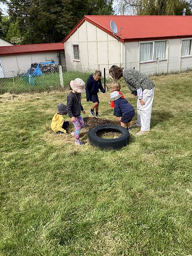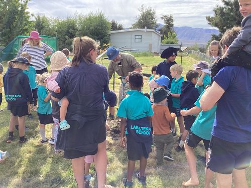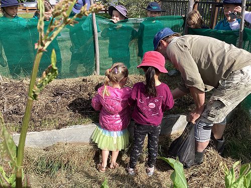 Kindergarten tamariki and kaiako popped over to the community gardens along with the school tamariki. There we met William Beauchamp as he talked briefly about the gardens and helped us to plant Māori potatoes.