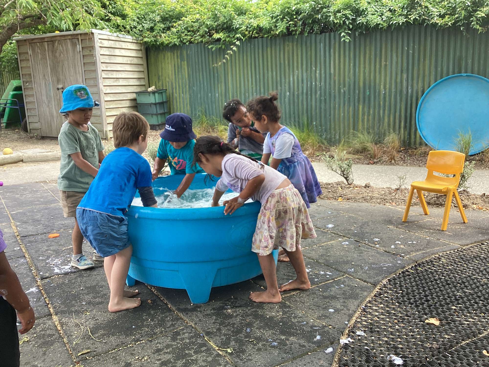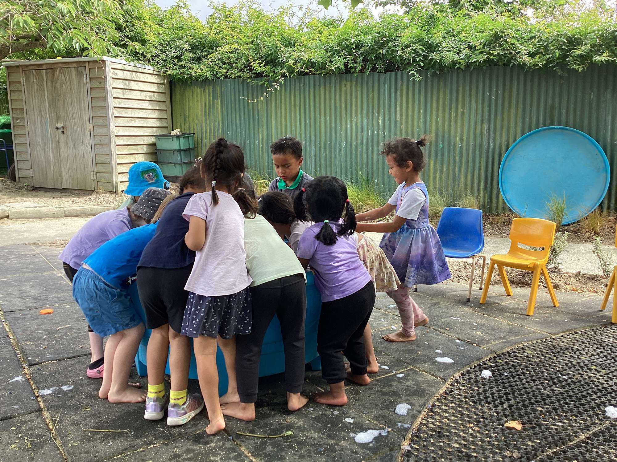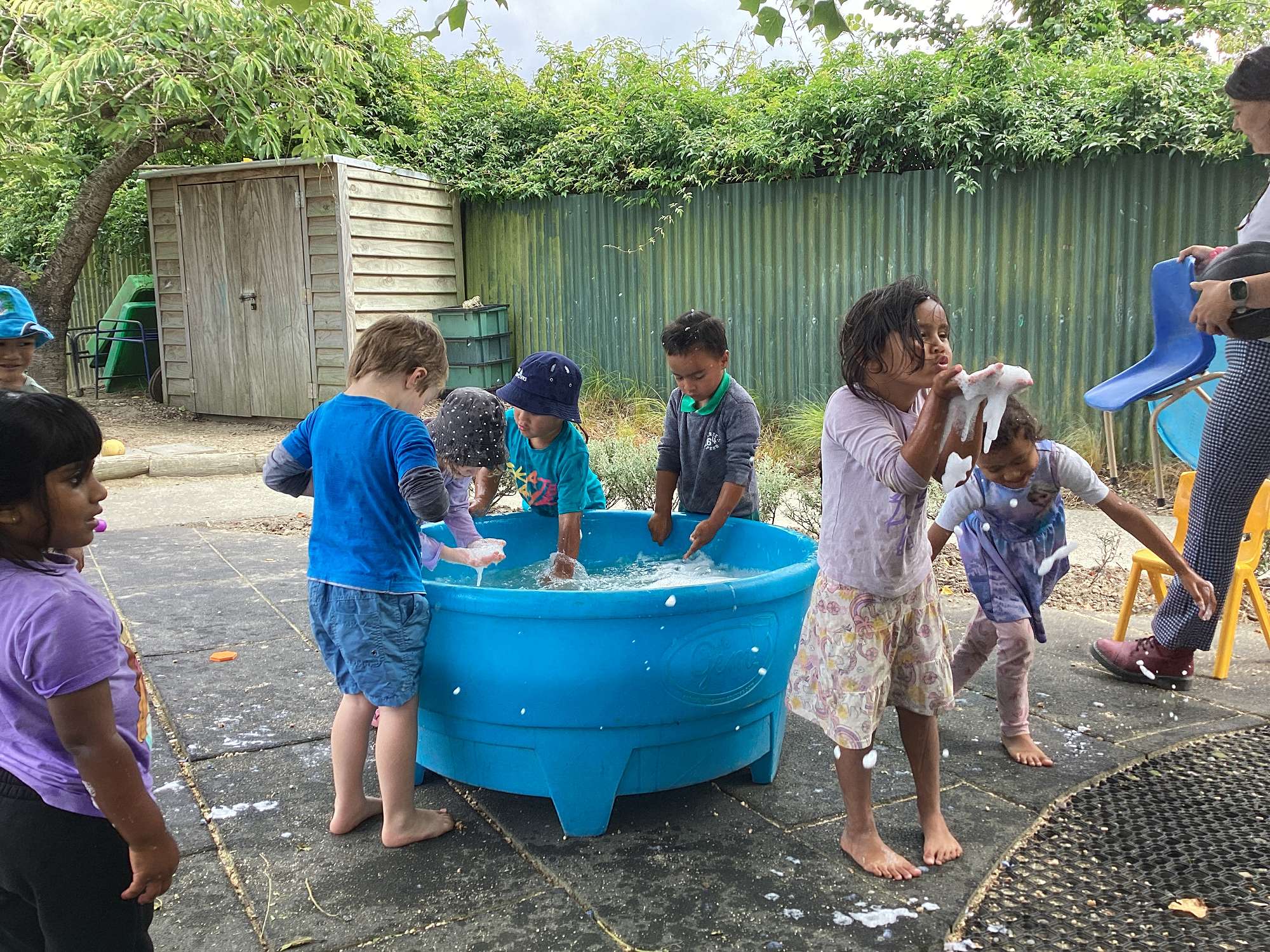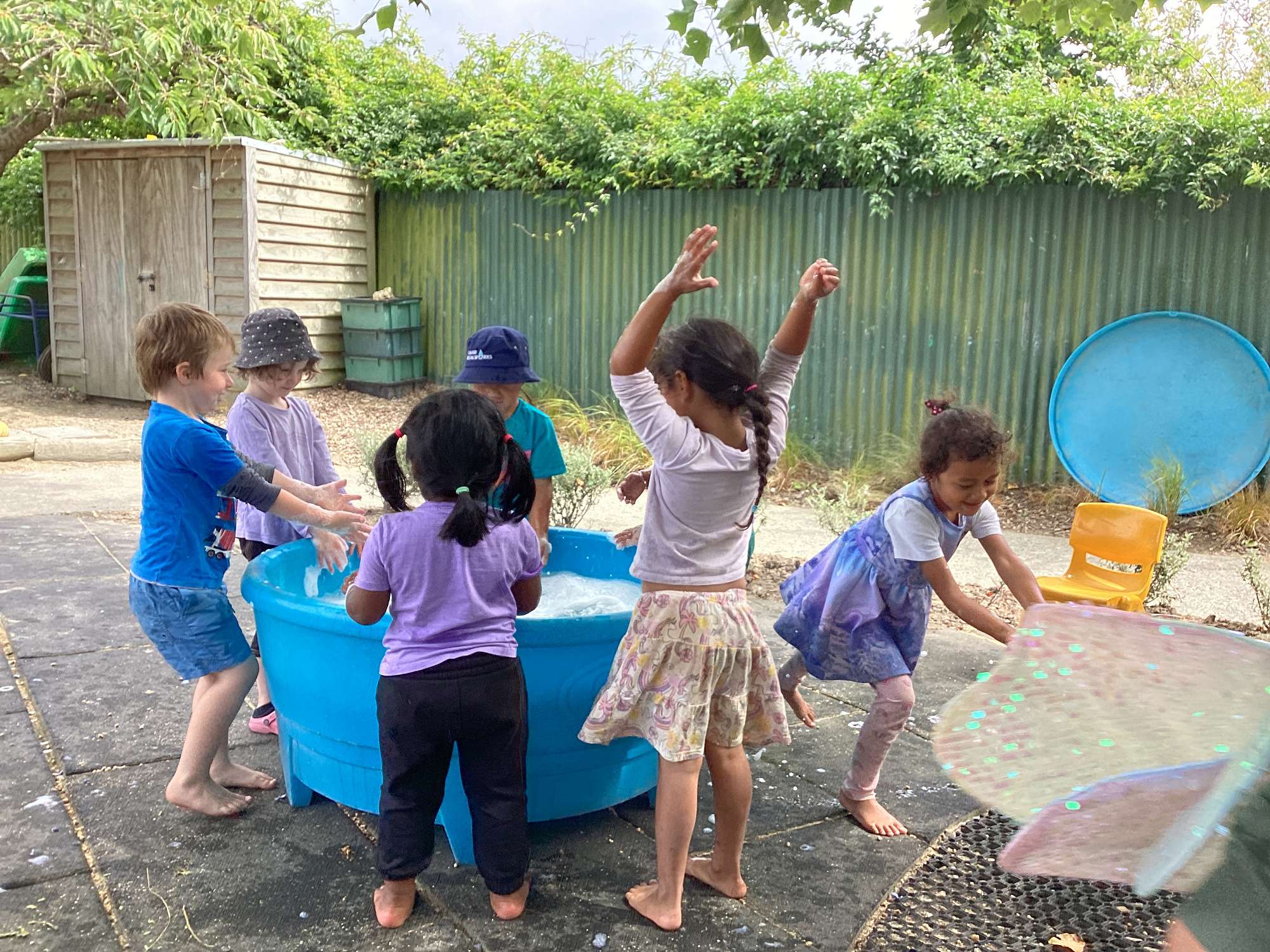 At the end of the kindergarten day, kaiako introduced water and bubbles, instantly drawing in the tamariki as they splashed, chased, and danced with the floating bubbles.