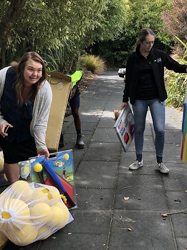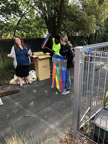 We were given rugby balls, soccer balls. basketballs, small balls, wiffle balls, a tee ball kit, and a basketball hoop. The children at Kowhai were so excited and appreciative. Two lovely employees, Dharma and Bradley, along with Ali, came along and showed us some soccer skills and generally had a good time. We were amazed that they had blown up every ball for us and constructed the hoop so that we were all set to play when they got here.
