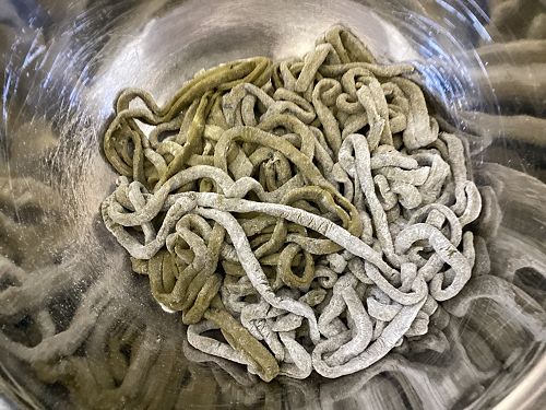 When we thought it looked nice and blended we turned it out and kneaded it for what seemed like days, we put it into a ball and then into the fridge...the very next day we rolled and rolled and rolled the dough adding flour as we went, we made the dough stretch out so so long and then we fed it through the pasta maker and out came long delicious fettucine wow!!!!!