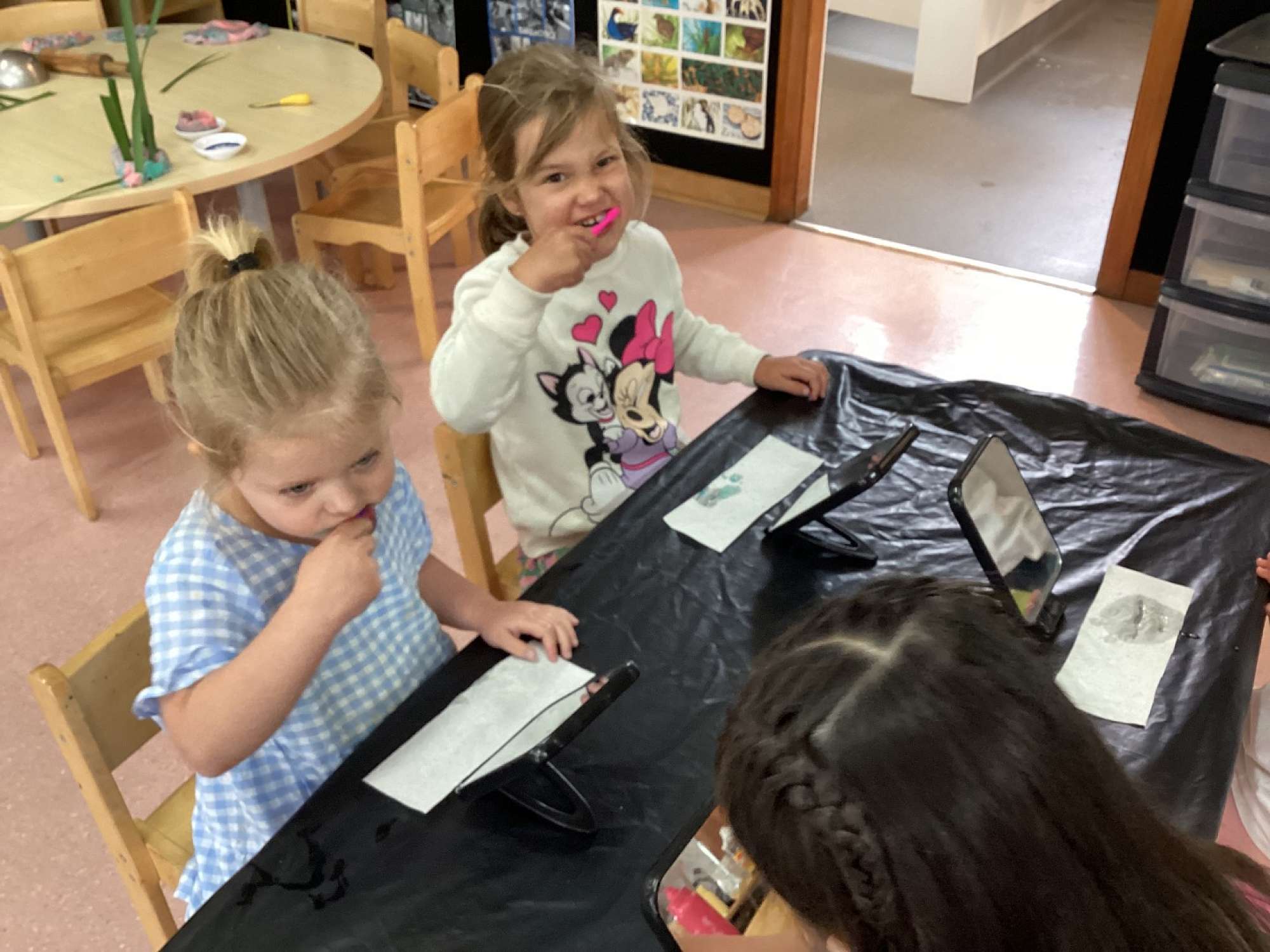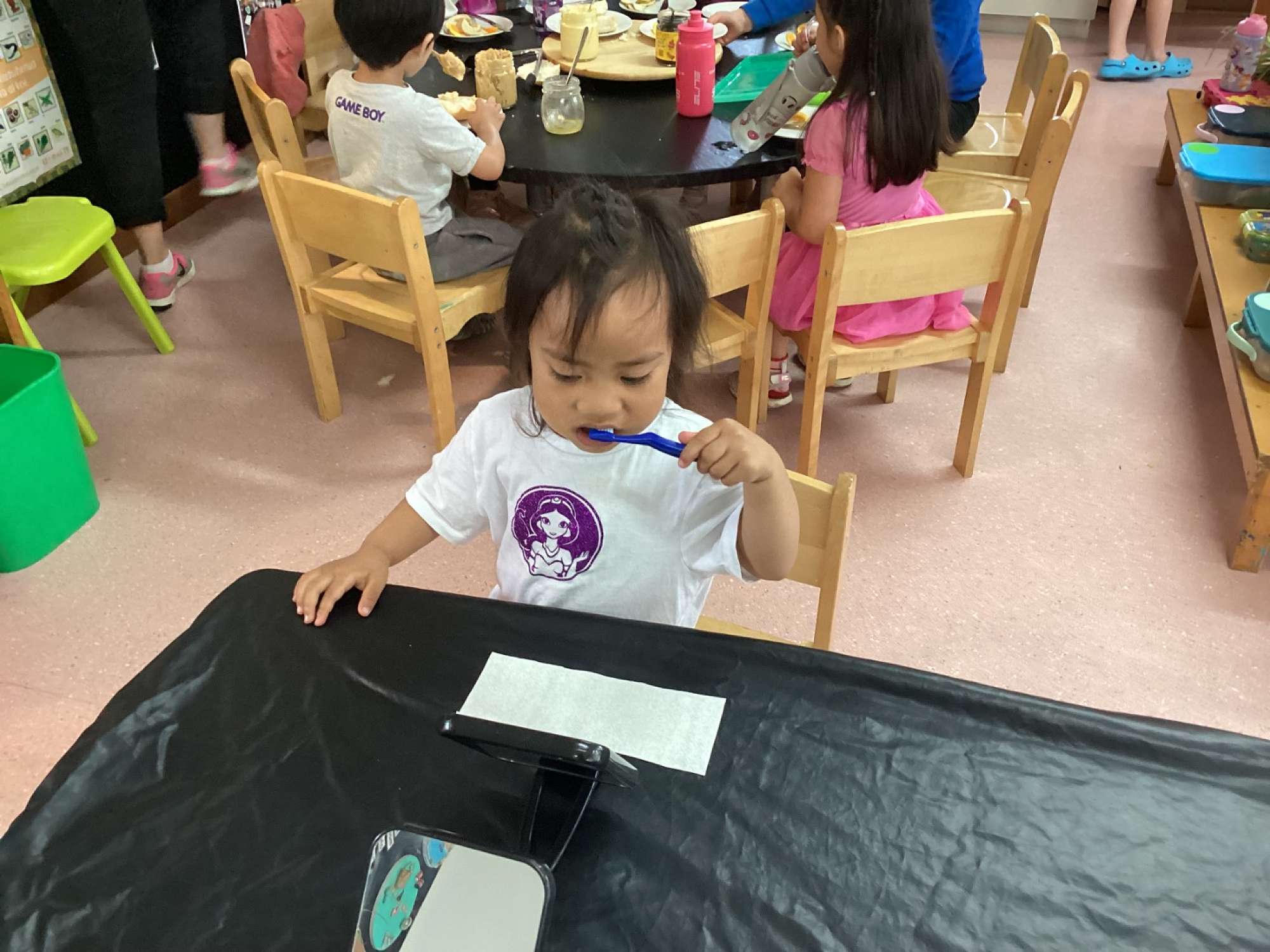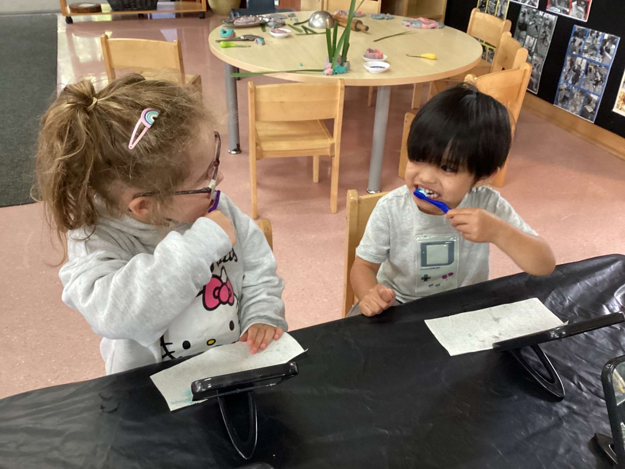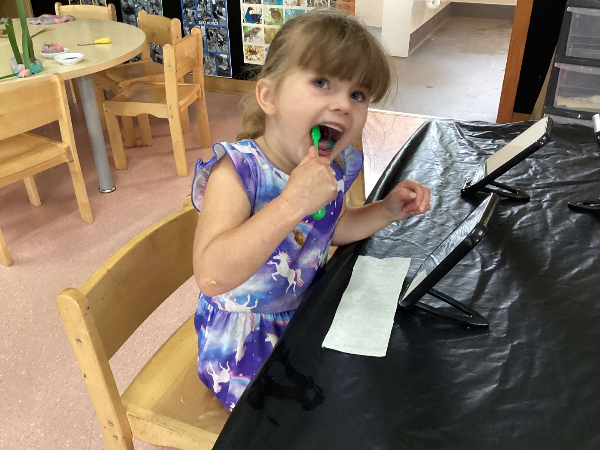 This is a wonderful learning opportunity that is optional for tamariki to participate in. When they choose to brush their niho tamariki competently know where to find their own toothbrushes, apply the toothpaste and sit themselves at the table in front of a mirror.