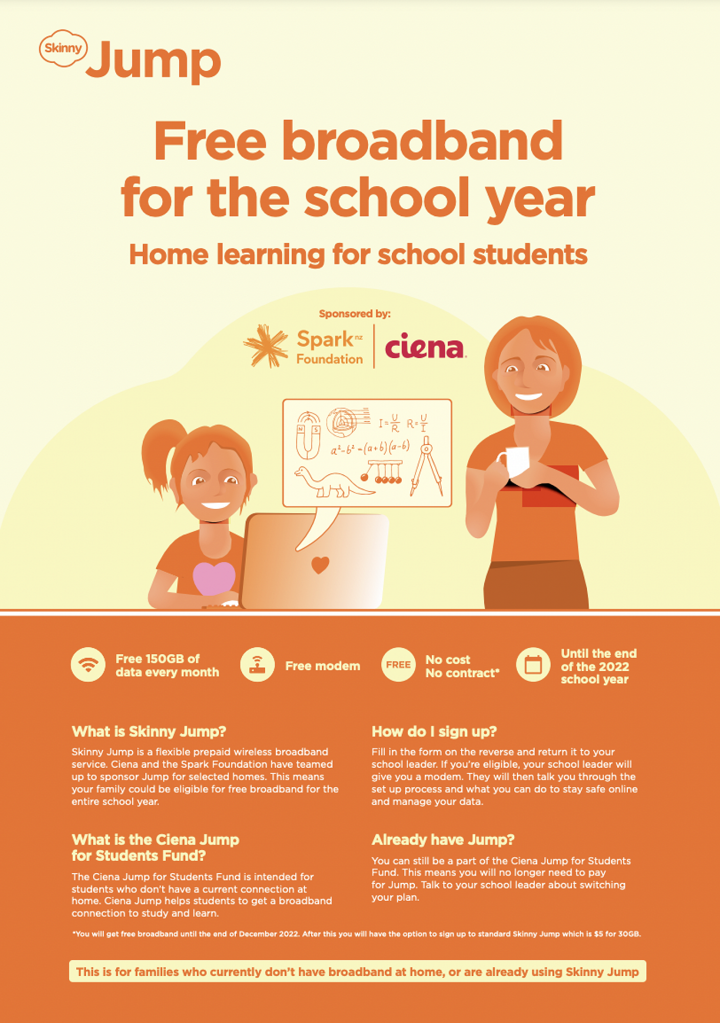 Free Broadband on "Skinny Jump" for Year 5-13 students.