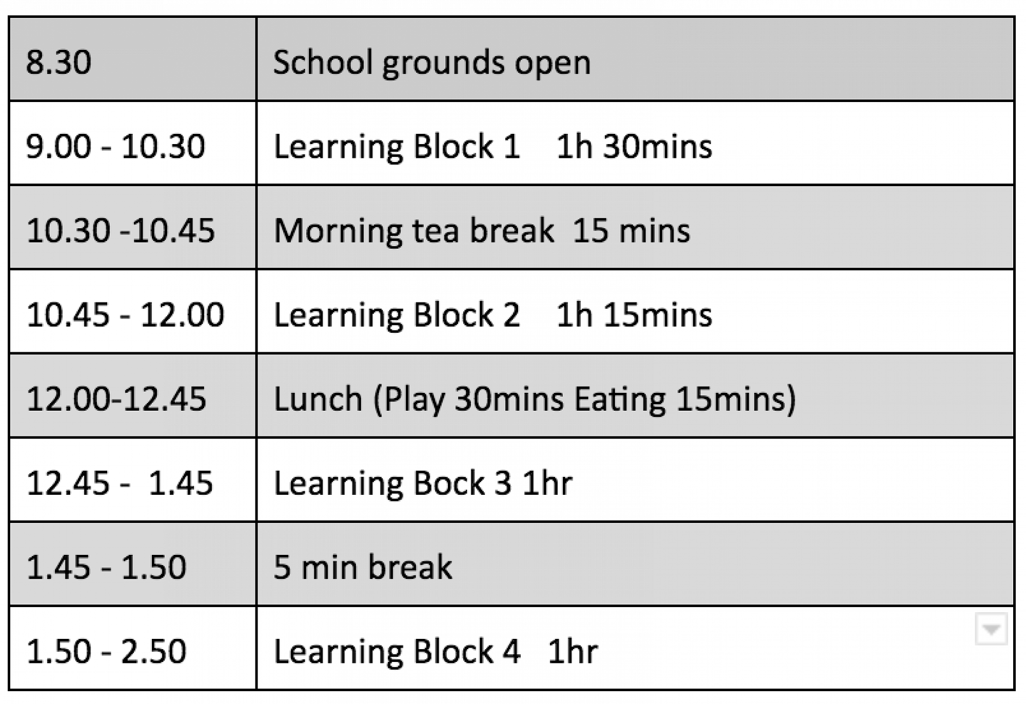 New entrants will attend school for the normal school hours. If a child is very tired and not coping with school an earlier finishing time can be negotiated with the New Entrant leader.