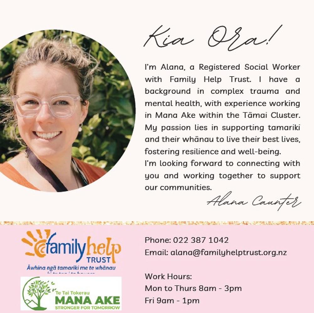 We welcome Alana Caunter, a registered Social Worker for Mana Ake to Southbridge School.