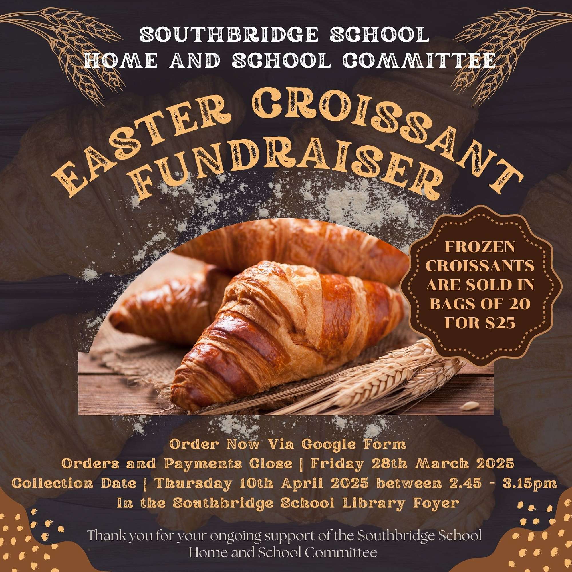 Southbridge Home and School Committee are selling bags of frozen croissants to raise money for our lovely primary school.
