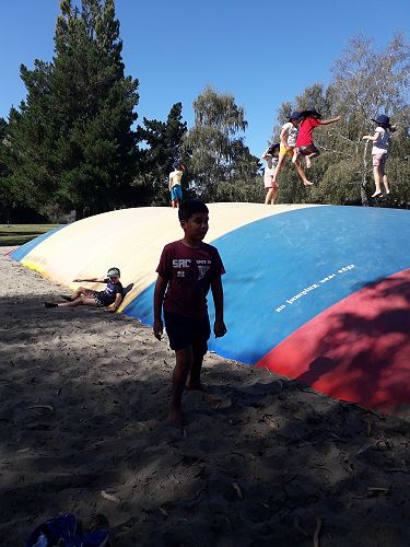 The next day we jumped on our bikes. There were three groups. The easy riders group, the middle group and the most confident riders group. Mrs McCartin’s group went on a little bike track around camp and then went through the forest. The other group went on twisty turny roads and ended up joining up with the second group. Kobe’s bike had broken so he had to ride Mrs Quilter's bike and she had to walk 5 miles back to the campsite. Mrs McCartin said that we had a choice to either go on the bouncy pillow, play some games, go on your bike or do some colouring-in.