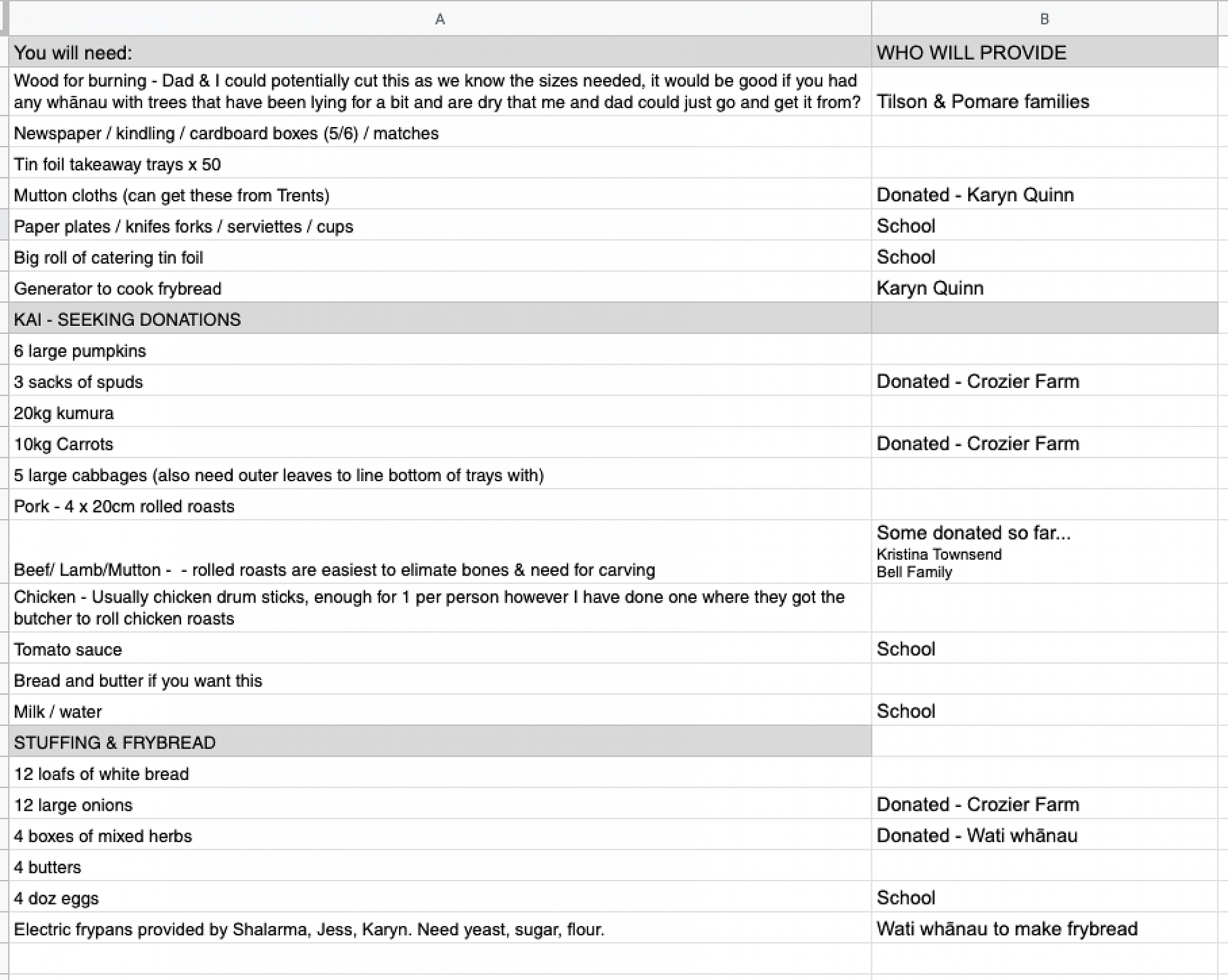 We are working on getting as many of these items donated as possible so the cost will be kept to just a gold coin donation which would go towards purchasing whatever else we need that wasn't donated and any left will be used as a small koha for the team of men laying the hangi...who all happen to be my own whānau, including my Dad, brother and uncle - this truly will be a family-friendly day!
