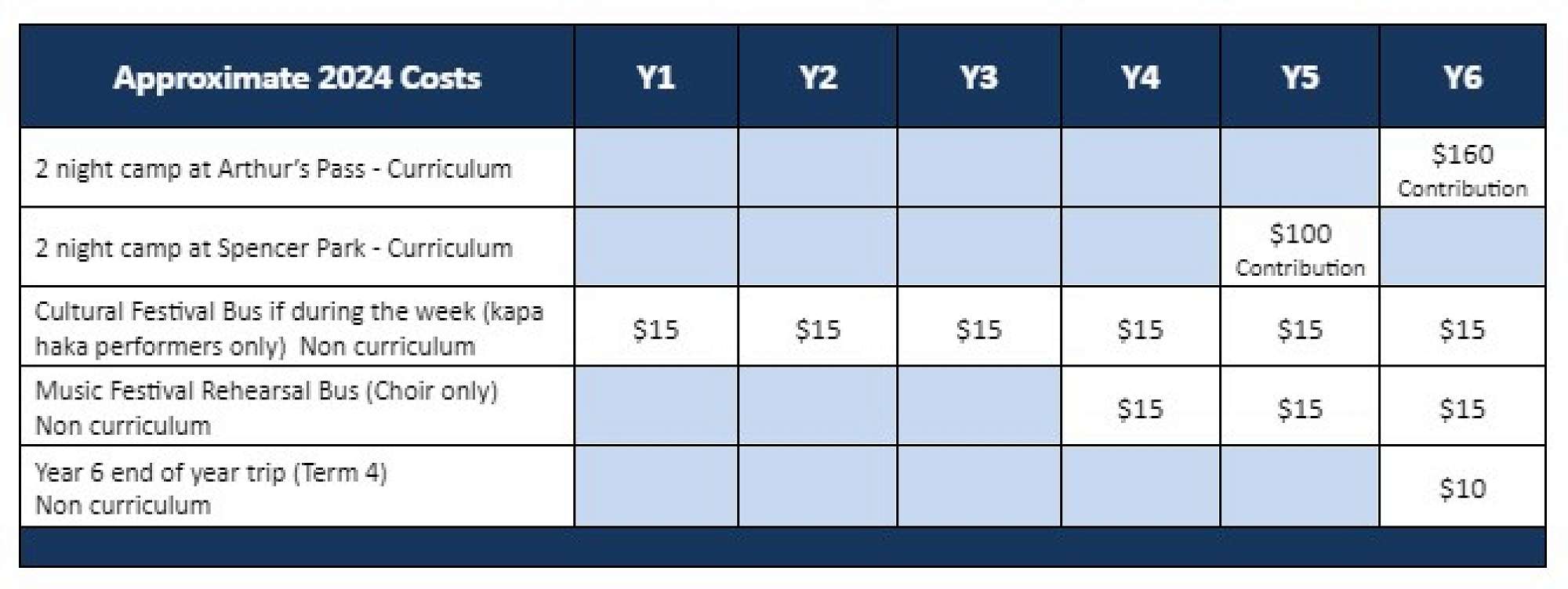 Please note that the Music Festival cost will be for choir members only and that the Cultural Festival cost will be for kapa haka members only as these are optional non curriculum activities. All activities will be invoiced separately to your child's account as the activity draws near.