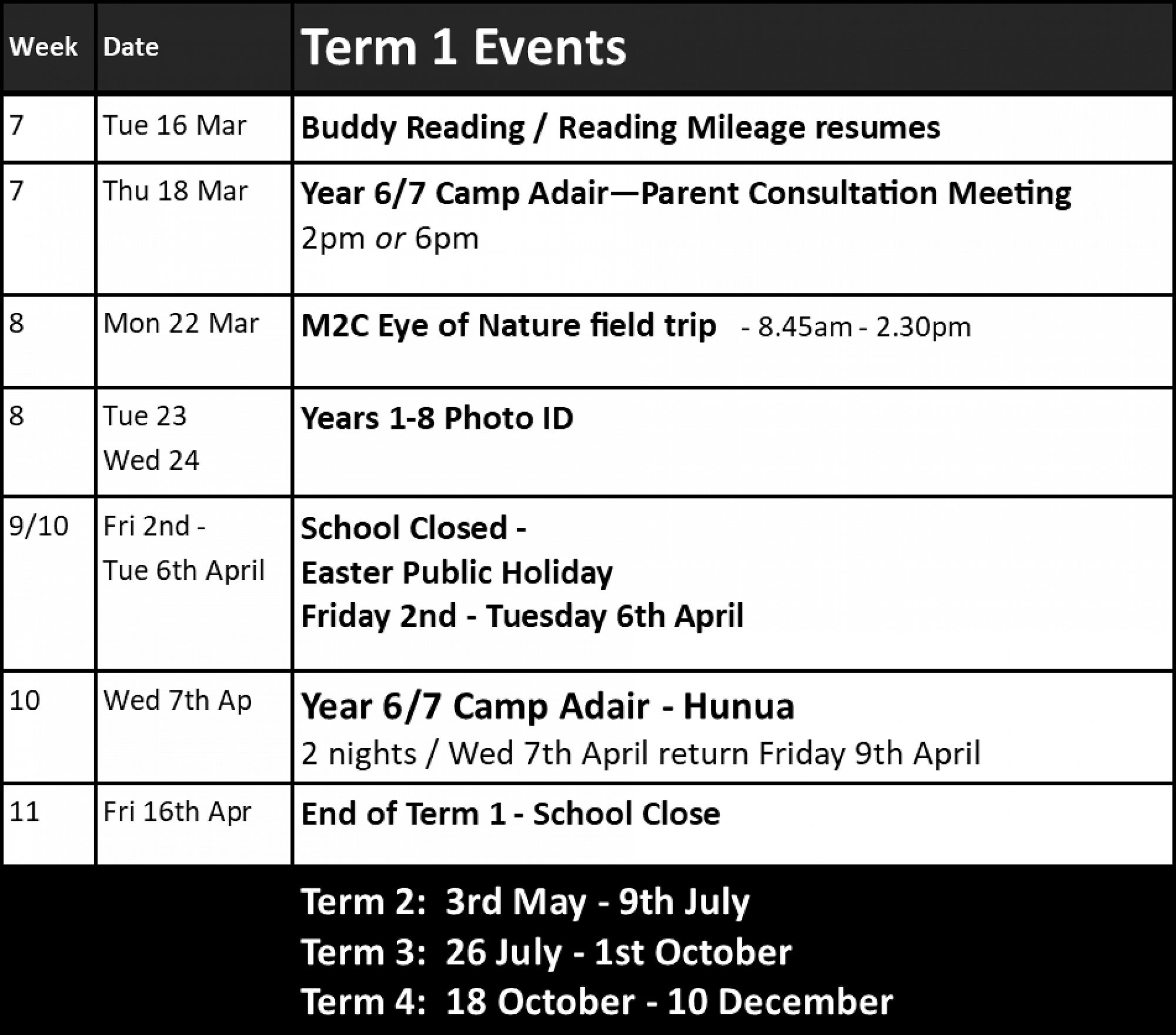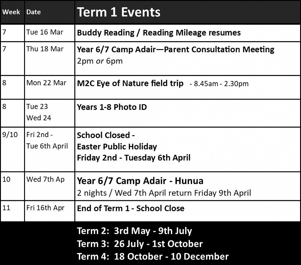Y4-8 Testing – we are underway with our testing for reading, writing and math over the next two weeks and it is important that all students are on time to school. Lessons start at 8:45am. The information from these assessments will help the teachers to plan the teaching programme for the later part of this term and into next term.