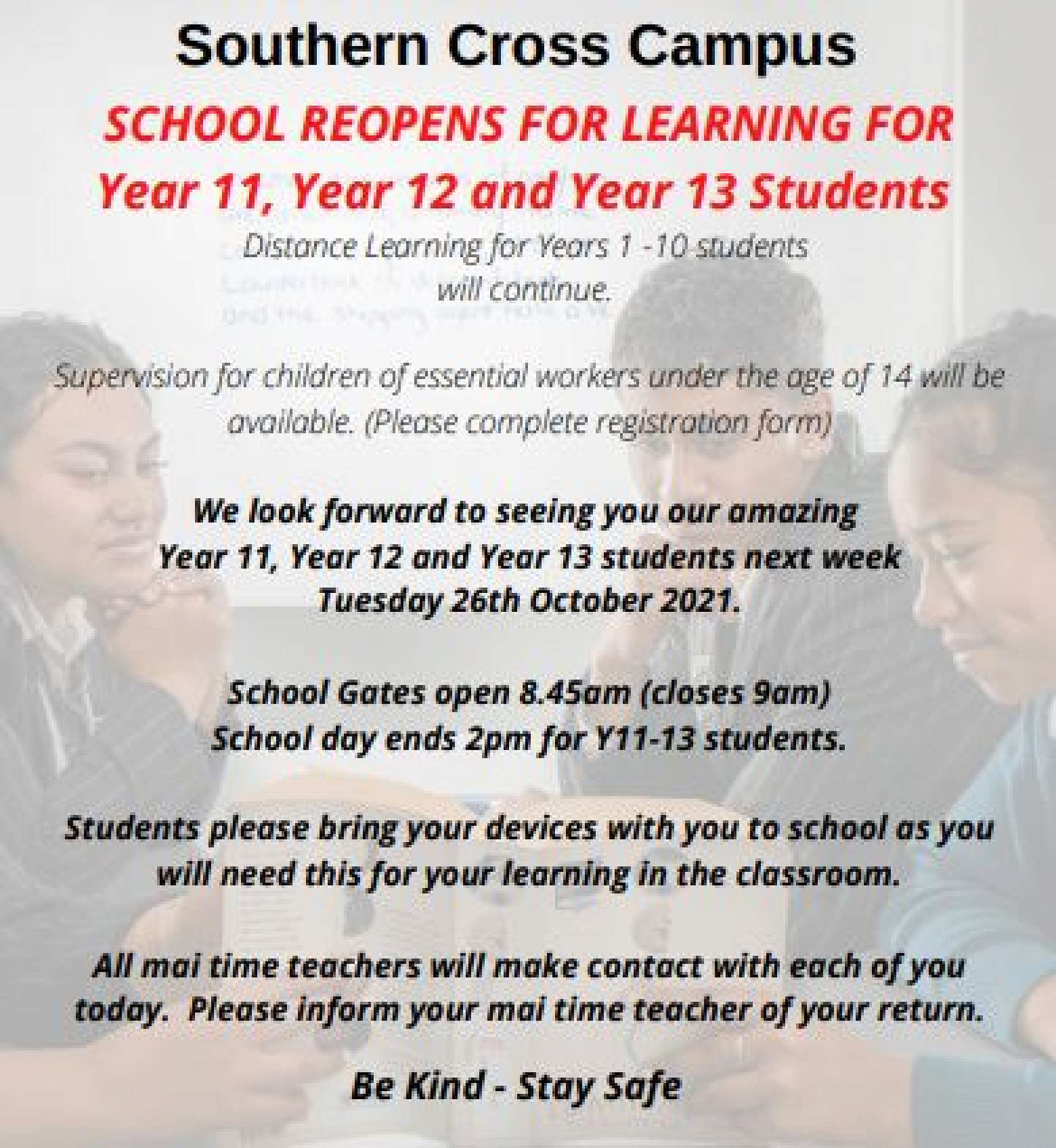 The Ministry of Education announced last week that all Year 11-13 students can return to school from Tuesday 26th October 2021. Since the announcement, we have been working hard to ensure that we have put in place the right health and safety processes and systems so that the safety of both staff and students come first.