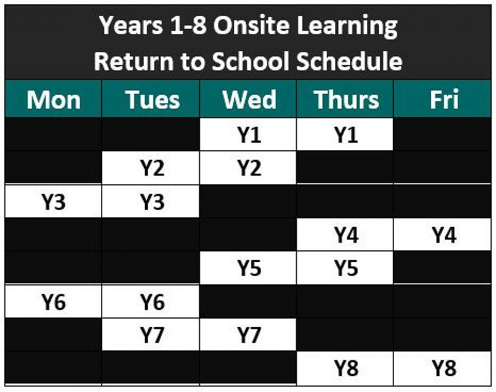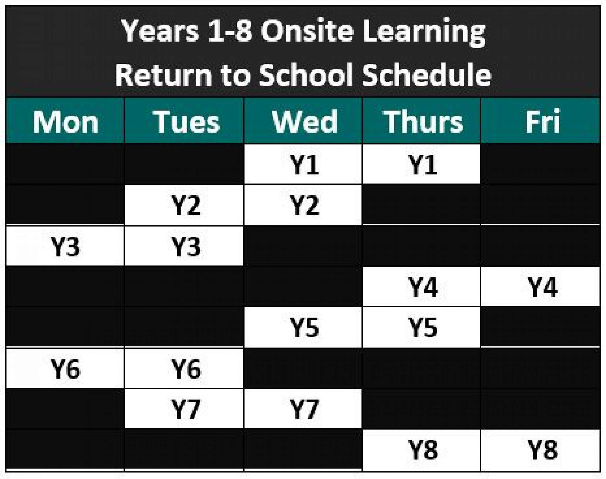 We have included below a possible timetable to show how year levels could be scheduled for on-site learning 2 days and distance learning 3 days within a week. Learning Times: 9am - 2pm