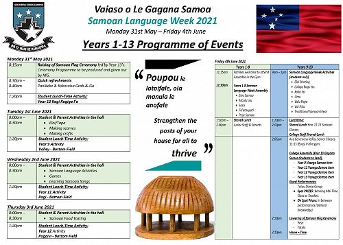 Families, come along and join us for our Language Week Activities in the hall from 8.00am - 8.30am Tues-Thu and for our Special Samoan Language Week Assembly 11.30am on Friday!