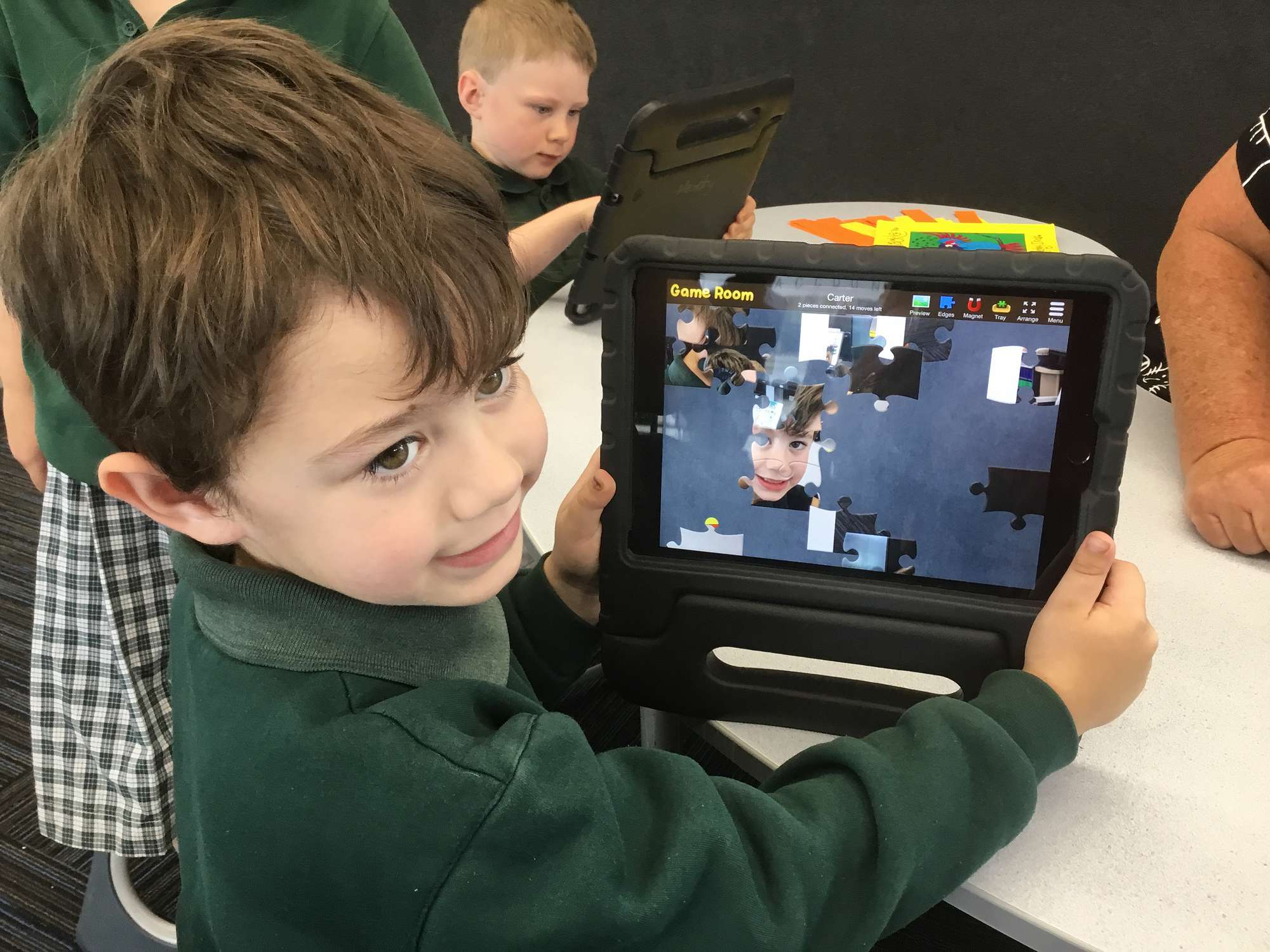 Learning how to take photos of ourselves to make a jigsaw on the i-pads.