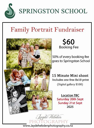 15min family session with Jayden Hebden Photography $60 booking fee, time slots opening soon more details to come (50% of the booking fee goes to Springston school)