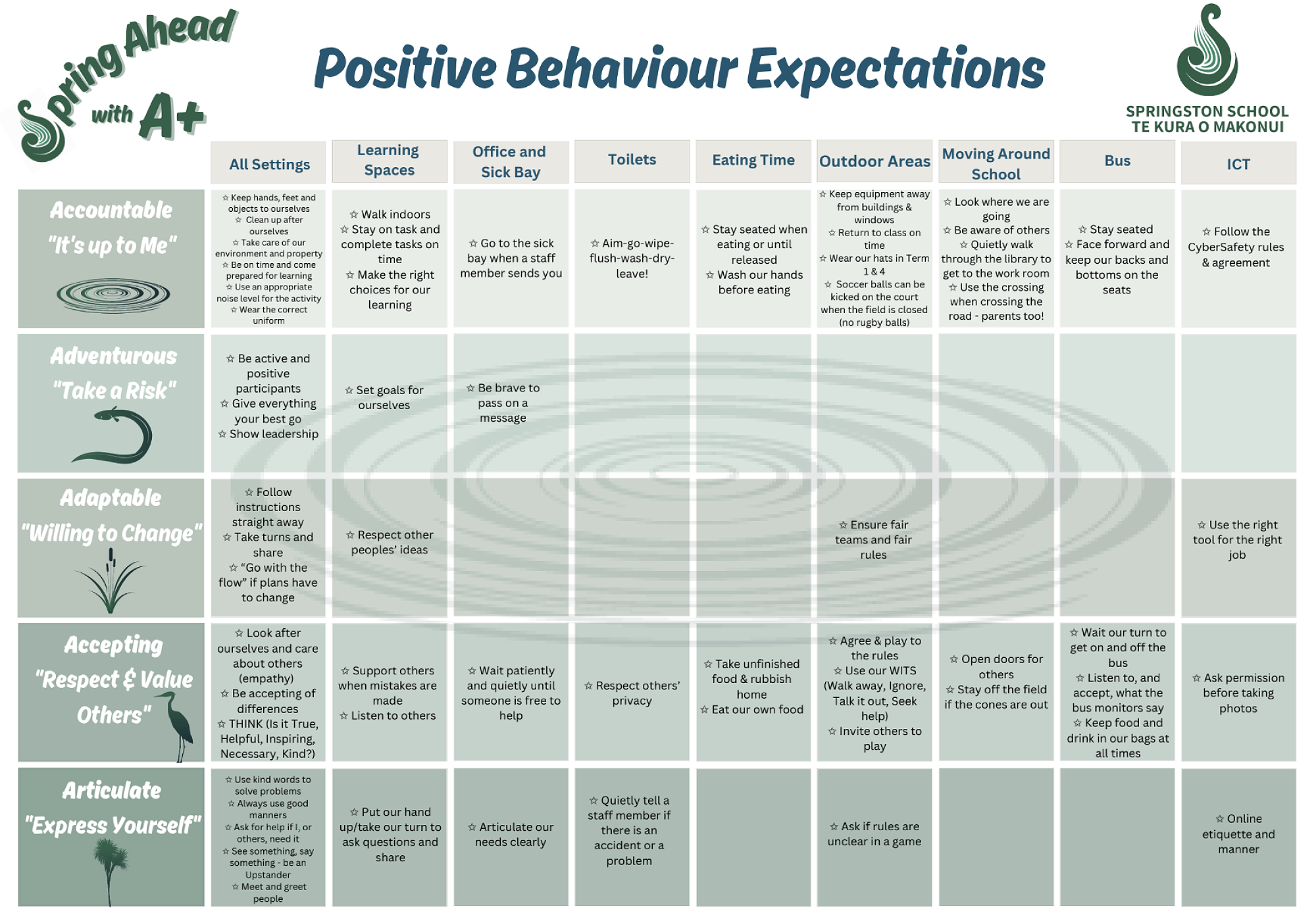 Each of the expectations in the matrix will regularly be taught in all learning spaces so our staff and ākonga clearly know what our expectations are and what they look like at Springston School. We have a new behaviour focus every 2-3 weeks which the whole school focus on.
