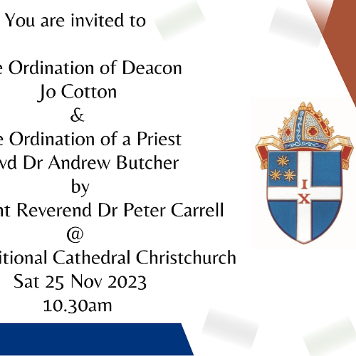 You are invited to attend the Ordinations of Jo Cotton and Revd Andrew Butcher on Sat. 25 Nov at 10.30am at the Transitional Cathedral.
