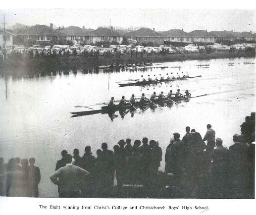 In 1964, hopes that St Bede's might be able to produce a winning Eight were not high at the beginning of the season. However, a well-coordinated training schedule saw the crew row 170 miles and carry out a number of strenuous ergometer tests in the lead-up to the Christchurch Inter-Secondary Schools' Regatta at Kerr's Reach. The Head-of-the-River title was to be decided before a large crowd containing its share of St Bede's supporters who no doubt helped propel the crew to a famous victory. The Christchurch Press reported at the time that "good, sustained and tenacious rowing gave St Bede's College a well-deserved win" over rivals Christchurch Boys' High School and Christ's College. David Lindstrom (1962-1966) stroked the crew and Michael McNab (1963-1966) the coxswain helped lead the Eights to a winning time of 5mins 9.8 seconds, one of the fastest times for the mile race recorded on Kerr's Reach.