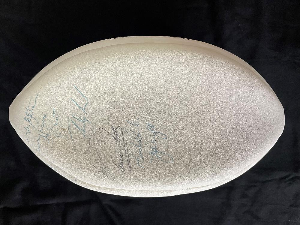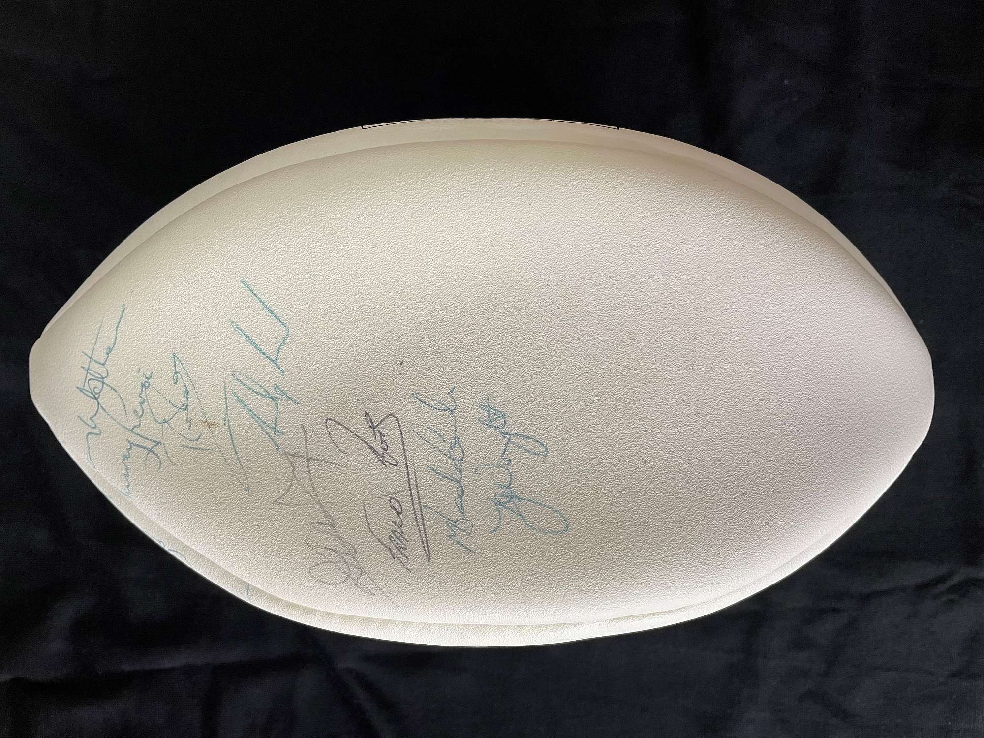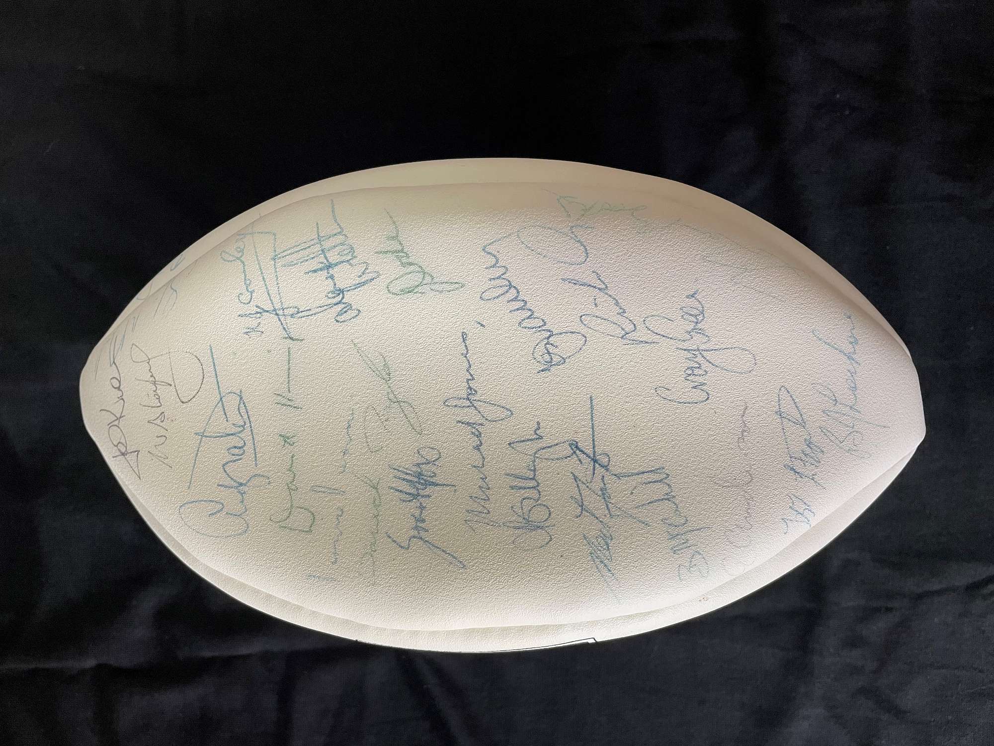 This rugby ball features the signatures of some well-known New Zealand rugby legends. A quick glance, and any rugby fan would be able to identify the signatures as belonging to the 1987 Rugby World Cup-winning All Blacks squad. Some of the more notable signatures include Sir John Kirwan, Wayne (Buck) Shelford, Grant Fox, Michael Jones, and Coach Brian Lochore just to name a few!
