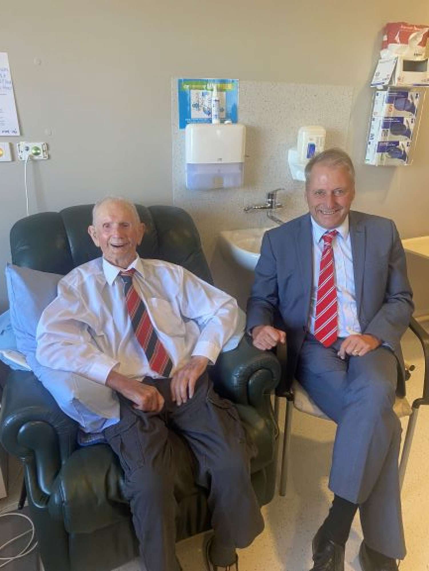 Pat sits in his chair proudly showcasing his St Bede’s memorabilia around his room (he now has more to add to his collection), opposite a wall full of family photos and a white board full of the names of the nurses and staff that care for him. Pat explained it is important to address people by their names, so he writes them on the board to help him remember. Pat could tell us a story about each of the people whose names are on his board.