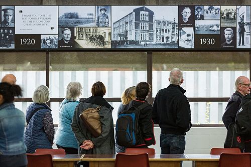 St Bede's College Graphic Designer and Old Boy Matthew Grueber (1998-2002) takes a moment to admire his work. The first of a series of art installations planned for St Bede's, that celebrate the people and the history of our College through pictures.