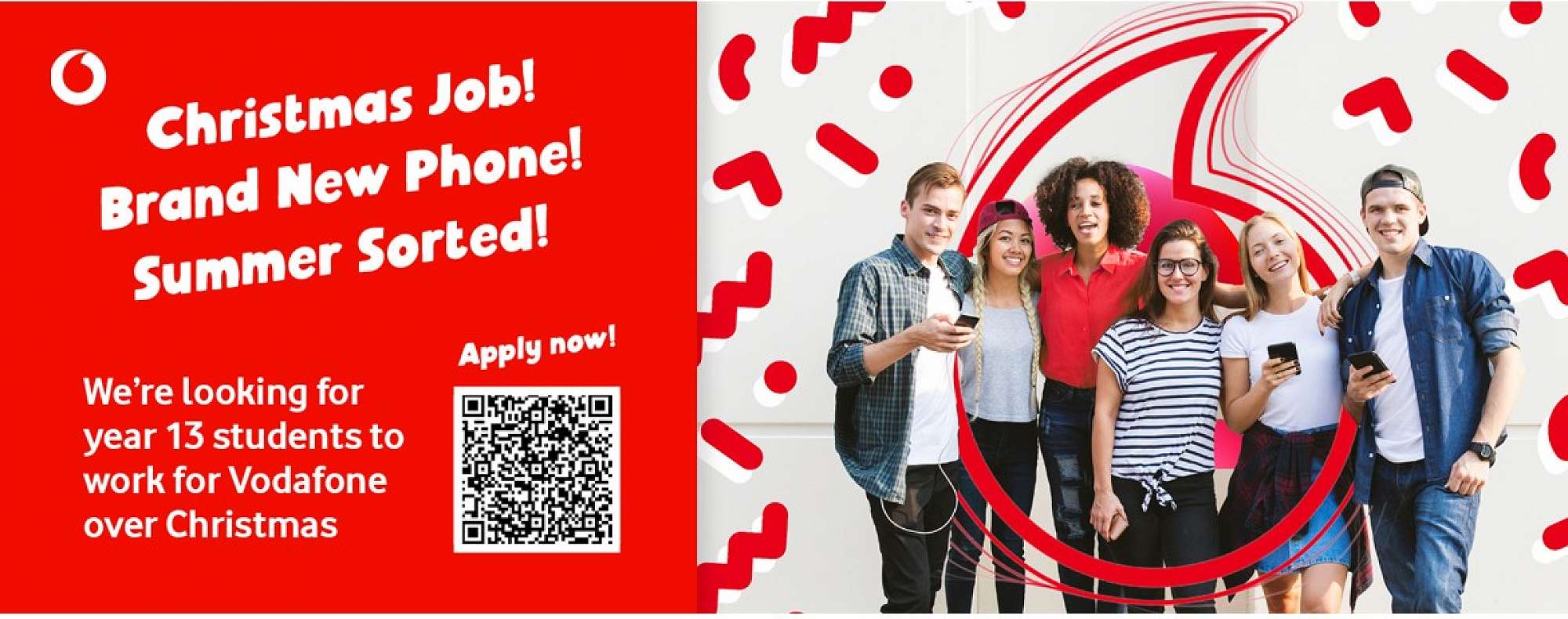 We are looking for Year 13 students to work as Santa's Trusted Advisors in our Vodafone stores over the summer period from late November to early January. They will greet customers, help them select phones and keep the store looking sparkly!
