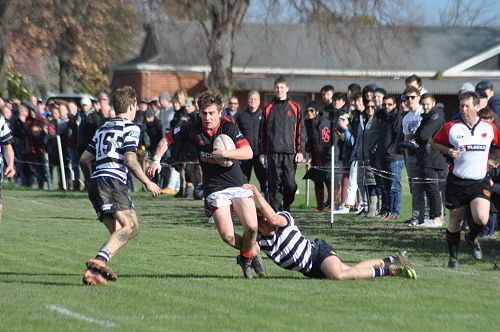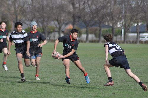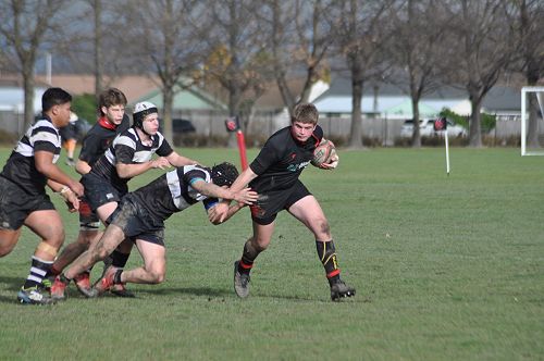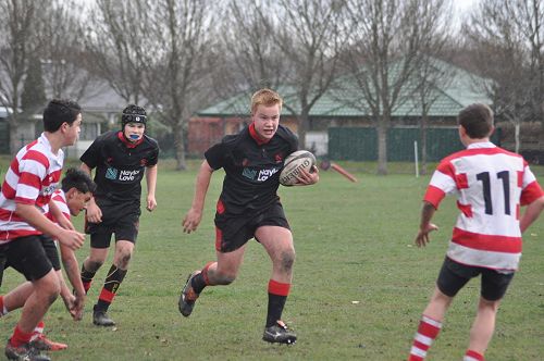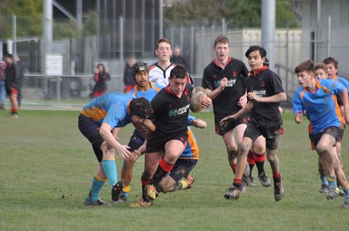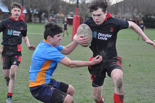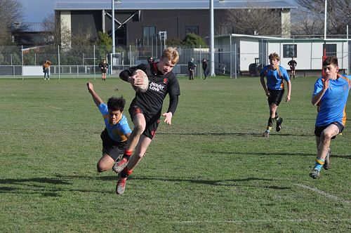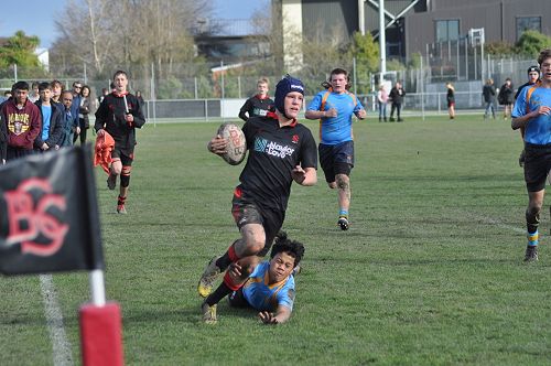 We had our final round robin game against a CBHS side which we lost to 5-40 earlier in the season. The boys were keen to even the ledger and had a plan to take them on up front before going wide as we knew their defence was good. The game started intensely and we were able to exert a bit of pressure but were unable to convert. The forwards were making big inroads with pick and goes and much better body position. When going wide it seemed there was more space than our previous game although their cover tackling was excellent. We worked an overlap down the right flank enabling Quinn O’Sullivan to cut back through the defenders sliding out to cover to open our account. The match then became a real tussle with both sides very even. Boys' High were able to get some phases together close to our line and despite some stout defence, were able to burrow over out wide. A good conversion from them had the scores tied at 7-7. The rest of the half saw us dominate overall with good variation with ball in hand going up the middle, wide or an attacking kick. Eventually Alex Cowan was able to break through with a strong carry to score a converted try for us to lead 14-7 at the break.