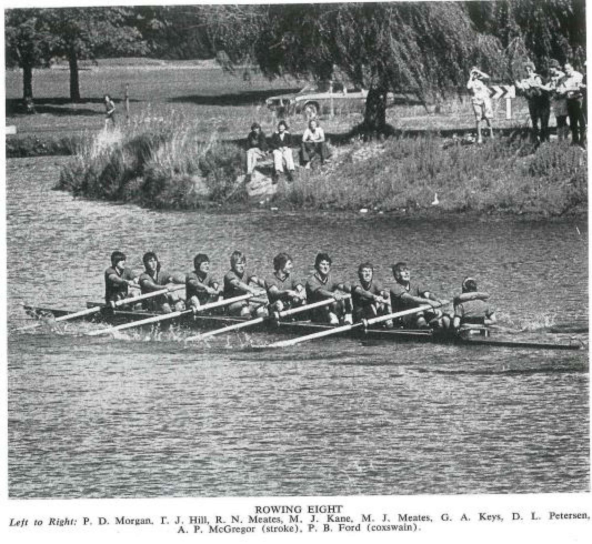 It was with great pleasure that the members of those crews watched St. Bede’s win the Springbok Four and the Maadi Cup this year. It also brought back bittersweet memories of the 1976 Maadi Cup regatta. The four of Andy McGregor, Mark Meates, George Keys, and Denny Petersen performed well in the heats and had a great chance to become the first South Island crew to win the four. Finals day saw a strong wind early in the day that created a pretty choppy surface. The St. Bede’s skiff, named the Jarrow, was not a big boat and the choppy conditions meant the four were struggling. We got to the front but didn’t clear out like we usually did. We caught a crab with about 10 strokes to go and got passed by Hamilton Boys, we came back, much like the Hamilton Boys eight this year but like them couldn’t get in front. It was the closest a St. Bede’s crew would come to winning the four until this year.