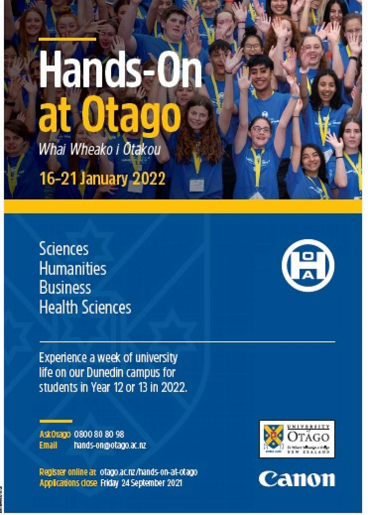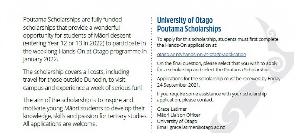 To apply online for both Hands-On at Otago and a Poutama scholarship, please use this link: https://www.otago.ac.nz/hands-on-at-otago/application