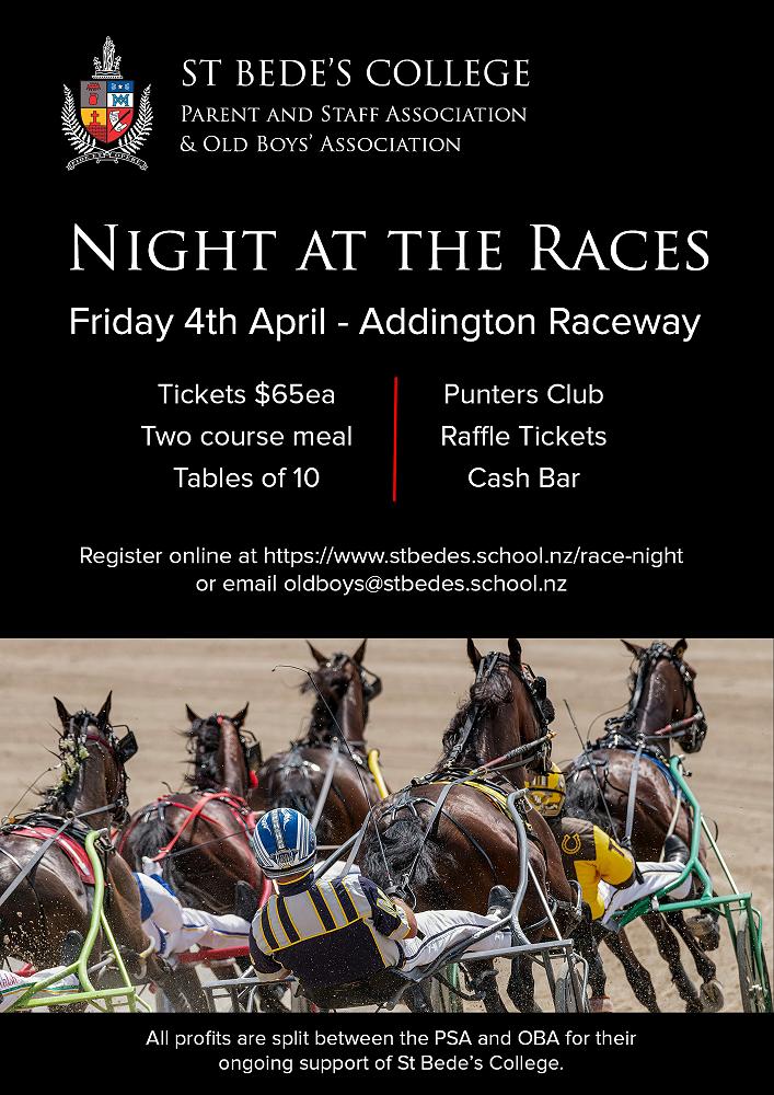To secure your spot, register online at https://www.stbedes.school.nz/race-night or email us at oldboys@stbedes.school.nz. We look forward to seeing you trackside!